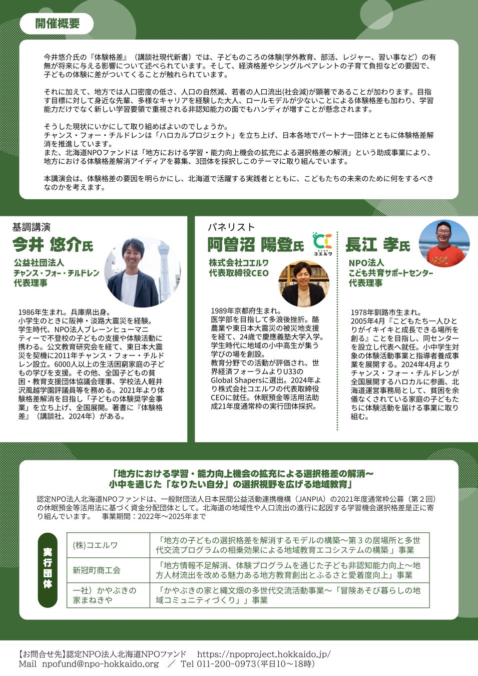 また、北海道NPOファンドは「地方における学習・能力向上機会の拡充による選択格差の解消」という助成事業により、地方における体験格差解消アイディアを募集、3団体を採択しこのテーマに取り組んでいます。本講演会は、体験格差の要因を明らかにし、北海道で活躍する実践者とともに、こどもたちの未来のために何をするべきなのかを考えます。