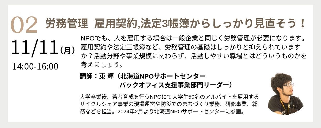 NPOの活動をより効率的に、そして効果的に進めるためには、バックオフィス業務(事務局業務)の整備は重要です。日々の業務で直面する課題や悩みを一緒に考え、解決策を見つけていきましょう。本講座では、NPOの活動で避けては通れないテーマを3回に取り上げ、皆さんの組織運営に役立つ実践的なスキルを身につけるお手伝いをいたします。参加者同士の意見交換を通じて、団体の成長を目指す場としてもご活用いただければと思います。共に学び、一緒に考えましょう!!