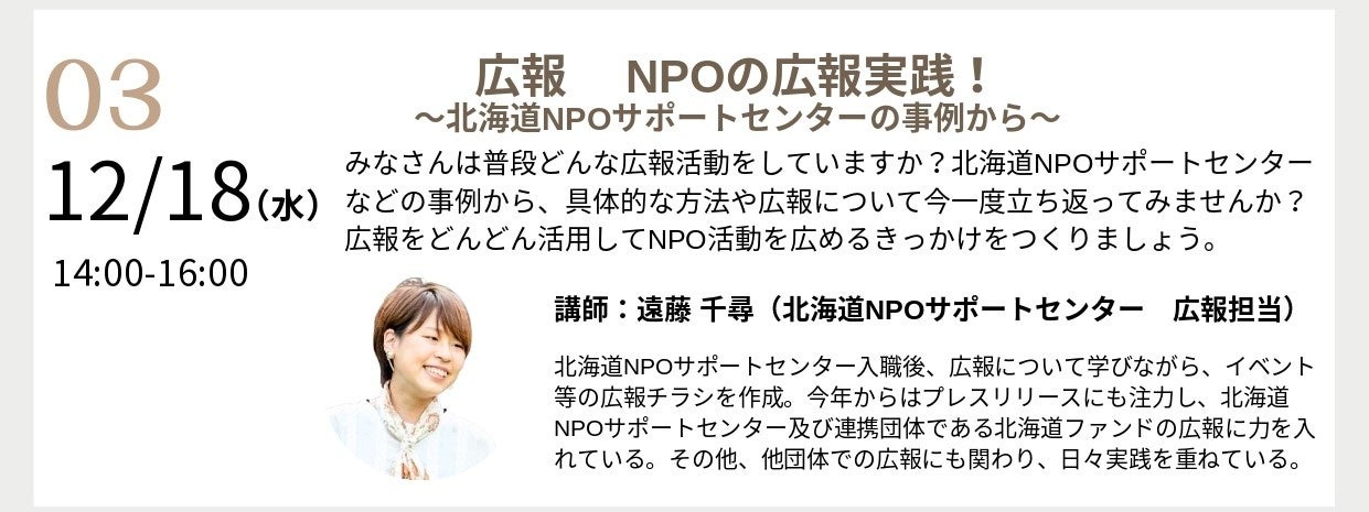本講座では、NPOの活動で避けては通れないテーマを3回に取り上げ、組織運営に役立つ実践的なスキルを身につけるお手伝いをいたします。意見交換を通じて、団体の成長を目指す場としてもご活用ください。