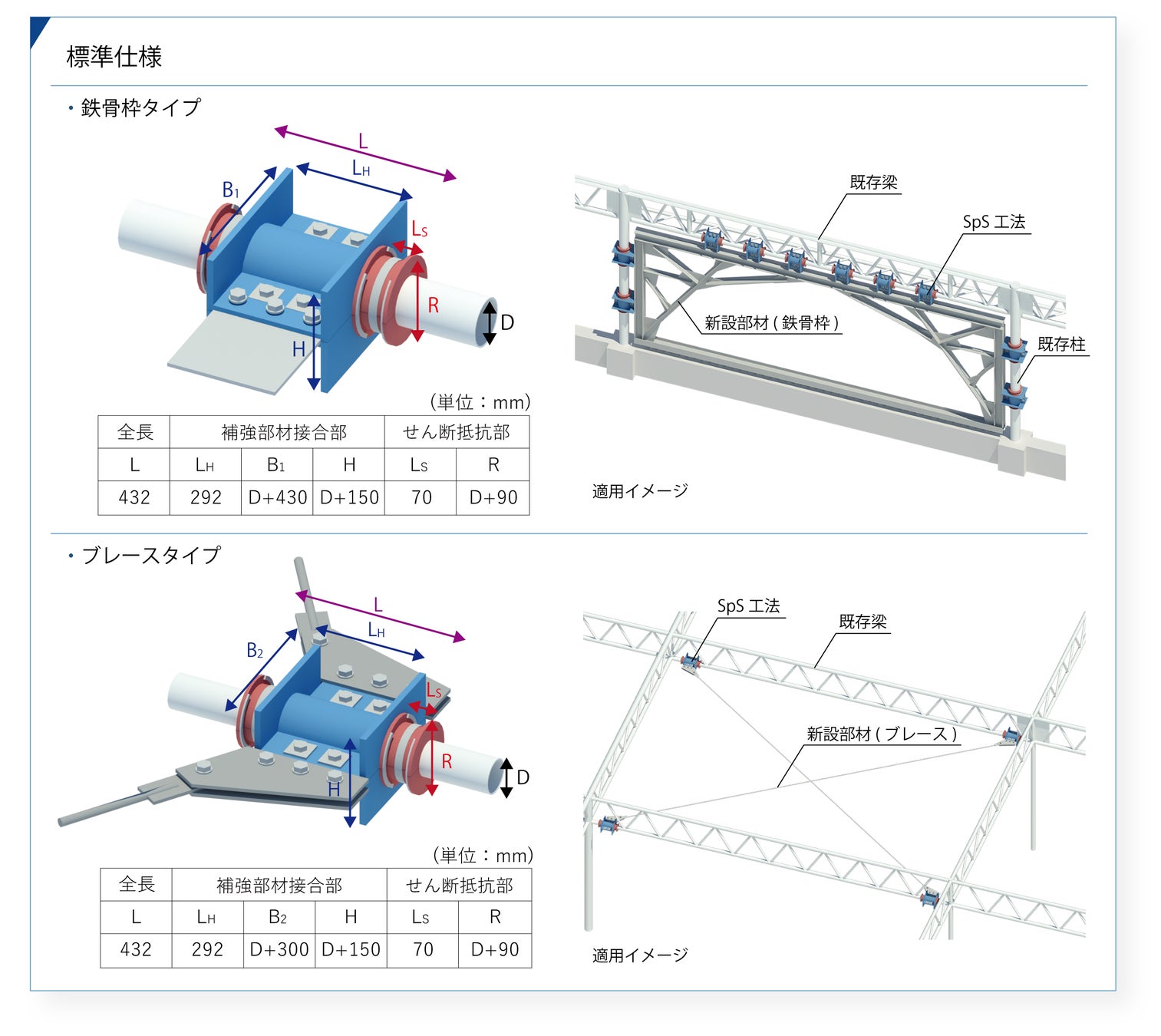 適用可能な既存鋼管は、直径48.6~318.5の鋼管単体または鋼管を用いた組立材です。取り付く新設部材に制限はなく、鉄骨枠などの新設を想定した「鉄骨枠タイプ」と水平ブレースなどの新設を想定した「ブレースタイプ」があります。(図3)