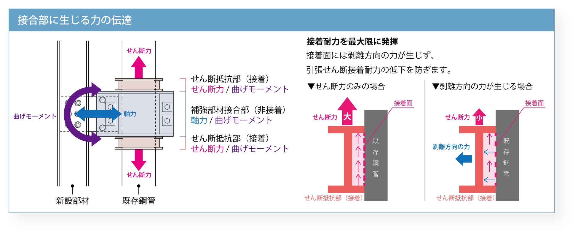 既存鋼管にボルト孔を設けないため、断面欠損が生じない