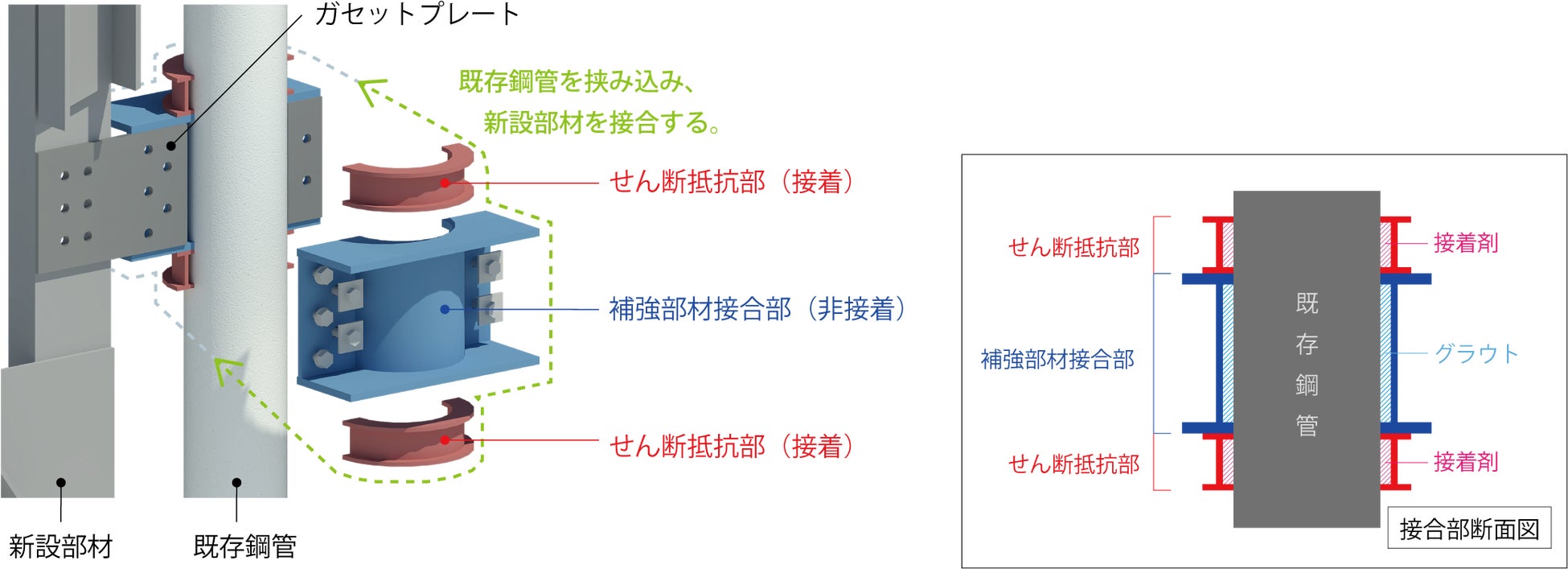 SpS工法は、新設部材が取り付く「補強部材接合部(非接着)」と、その両端外側に接するように設置される「せん断抵抗部(接着)」により構成される接合工法です。補強部材接合部は、専用金物(青色)で既存鋼管を挟み込み、ボルトにより一体化した後、専用金物と既存鋼管の内部にグラウトを充填します。せん断抵抗部は、内側にエポキシ樹脂を塗布した専用金物(赤色)で既存鋼管を挟み込み、一体化します。