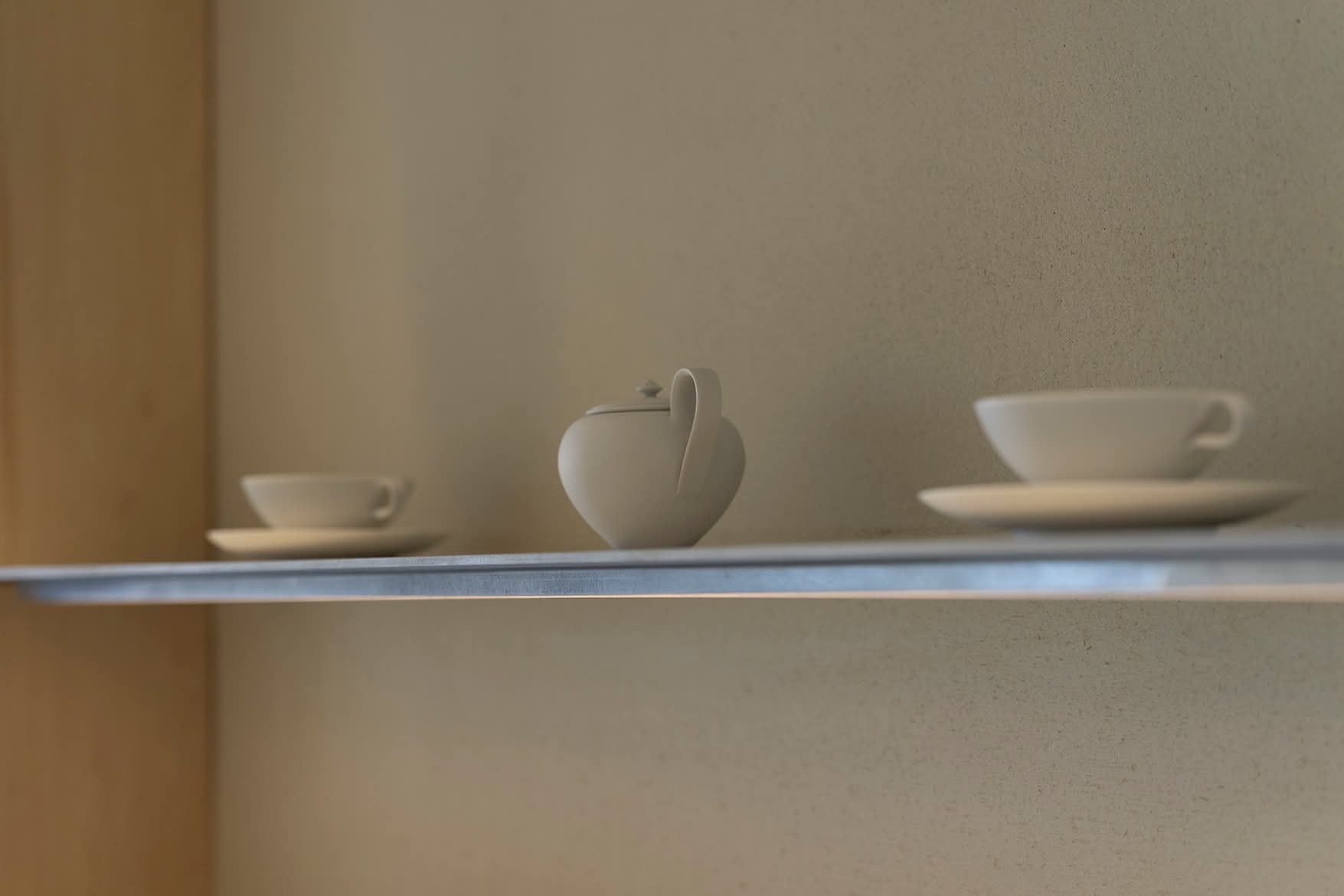 和紅茶2種からと季節の生菓子を組み合わせた「生菓子セット」や、水出し茶を含む「お茶のみセット」など、お茶の香りを多面的に楽しめるメニューをご用意しています。建築デザインは、素材の質感や余白を生かした静謐な佇まいが特徴。日常の喧騒を離れ、茶葉の香りとともに心を整えるひとときをお楽しみいただけます。