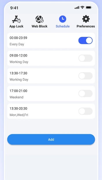 スケジュール機能はアプリロックとサイトブロック機能に影響を与えます。デフォルトのスケジュールでは、永久にアプリをロックし、サイトをブロックします。