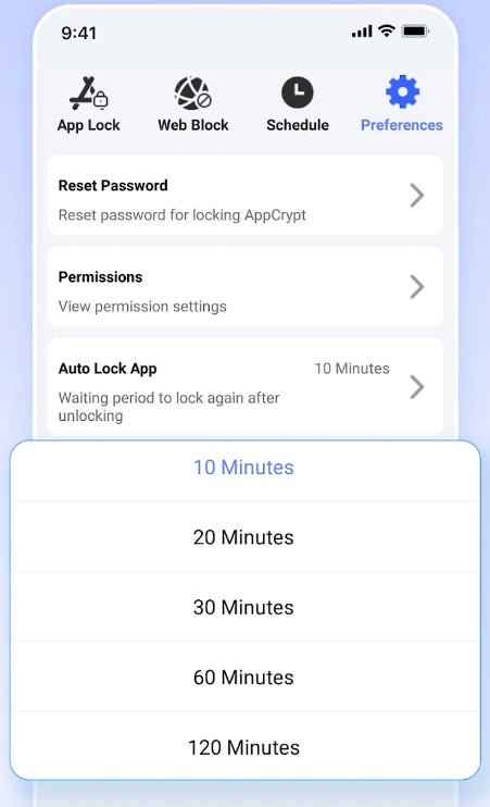 AppCryptはUIが直感的で分かりやすいですので、誰でも簡単に利用できます。アプリを保護したり、特定の時間帯でアプリをロックしたり、気が散るサイトをブロックしたりするのに使用できます。