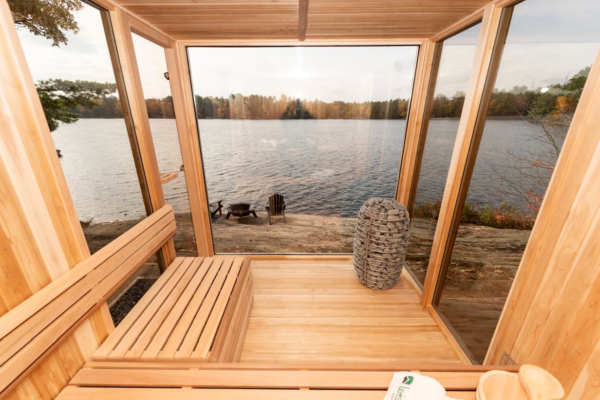 同製品は180°ガラス張りである側壁が魅力的なサウナです。