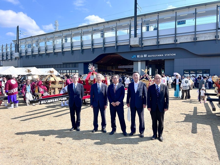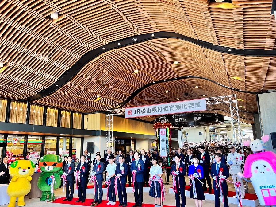 9月29日、愛媛県松山市にあるJR予讃線 松山駅の新駅舎開業に伴う記念式典が開催されました。当日は、晴天に恵まれJR四国、松山市、施工会社、地元関係者をはじめ、多くの参加者が新駅舎の完成を祝いました。