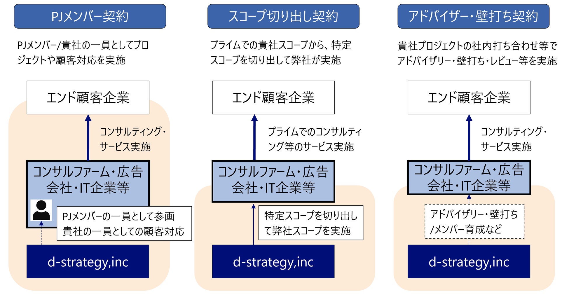 また、企業・スタートアップとともに、コンサル会社・IT/ソリューション企業・広告会社などのエンド顧客企業を持たれている企業のご支援も実施しております。アドバイザーや営業支援、プロジェクトメンバーとしての後方支援やプロジェクト遂行支援・リサーチ支援、コンサルファーム・ソリューション企業の一員としての顧客対応まで、幅広く後方支援・伴走いたします。