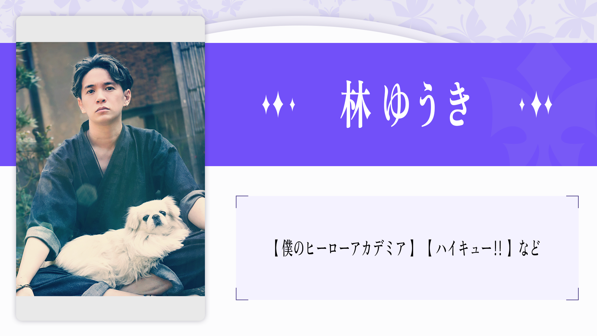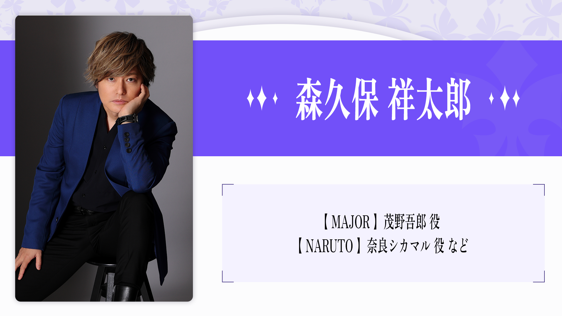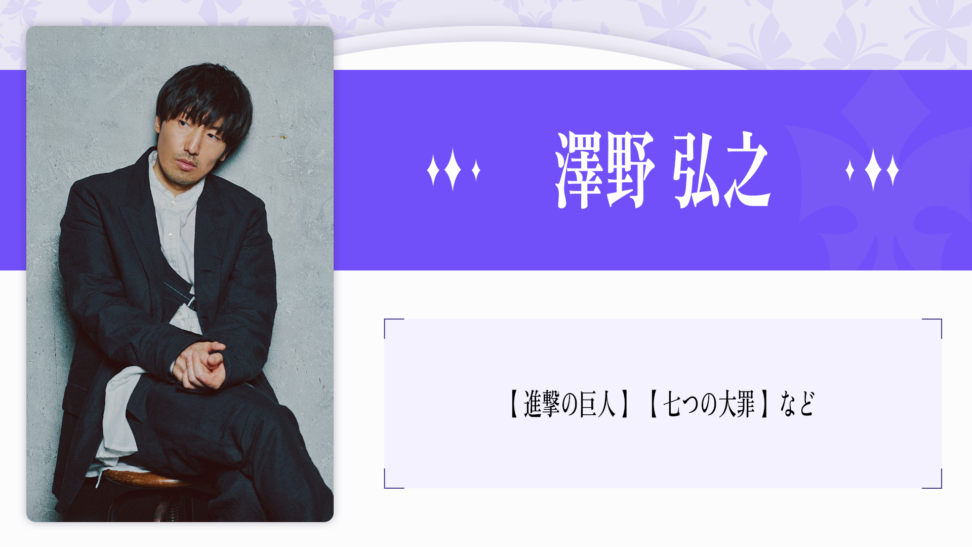 2023年、自身の声優歴 20 周年を記念したプロジェクト『そよぎフラクタル』を発表。 アニメ、吹き替えをはじめ、ラジオ、ナレーション、映像、舞台など幅広い活躍を続け る。過去、その年に最も印象に残った声優を表彰する声優アワードにて、史上初にして 唯一、2 年連続で主演男優賞を受賞。その声に、人の脳や心に癒しや安らぎを与える「1/f ゆらぎ」の響きを持つ。