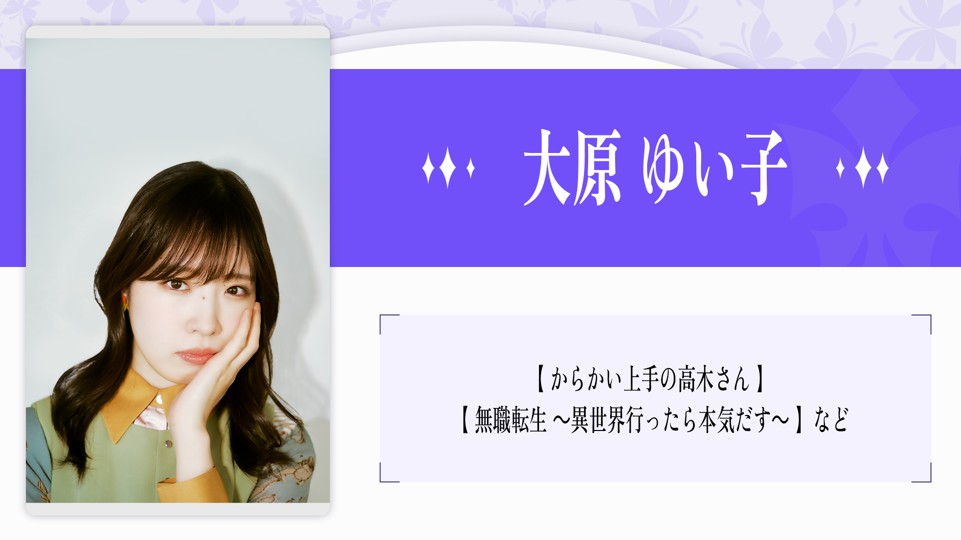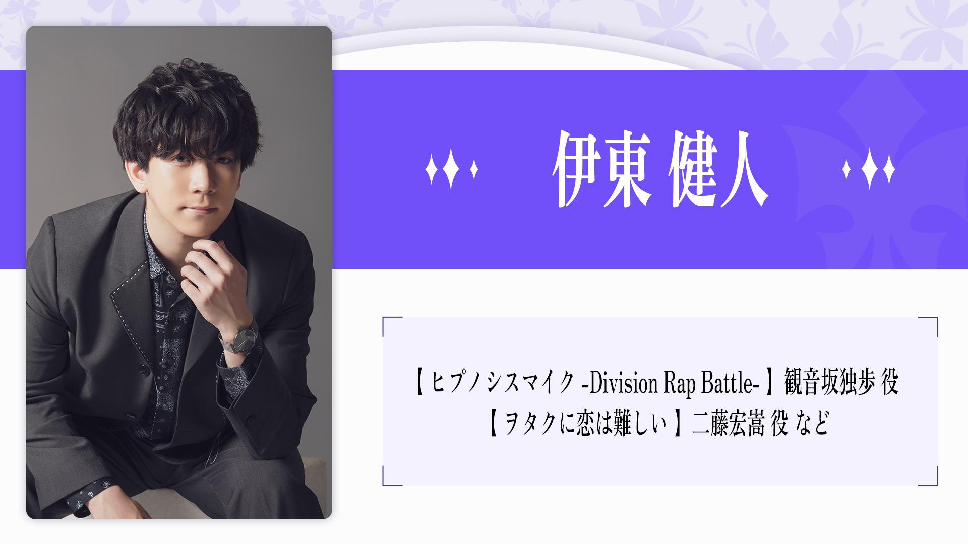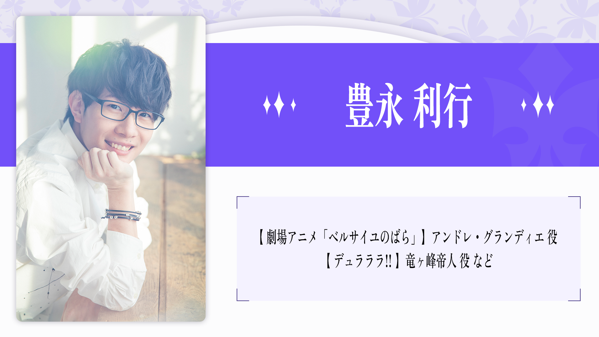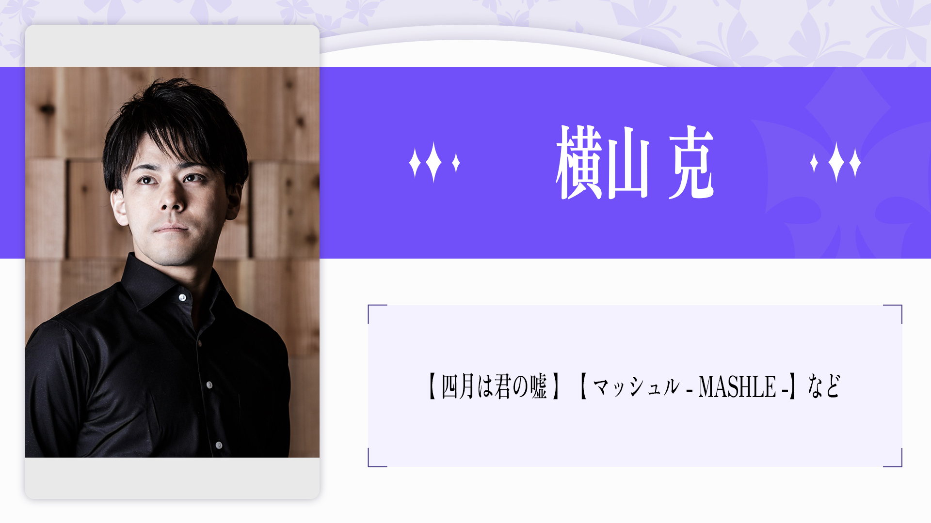 2023年、自身の声優歴 20 周年を記念したプロジェクト『そよぎフラクタル』を発表。 アニメ、吹き替えをはじめ、ラジオ、ナレーション、映像、舞台など幅広い活躍を続け る。過去、その年に最も印象に残った声優を表彰する声優アワードにて、史上初にして 唯一、2 年連続で主演男優賞を受賞。その声に、人の脳や心に癒しや安らぎを与える「1/f ゆらぎ」の響きを持つ。