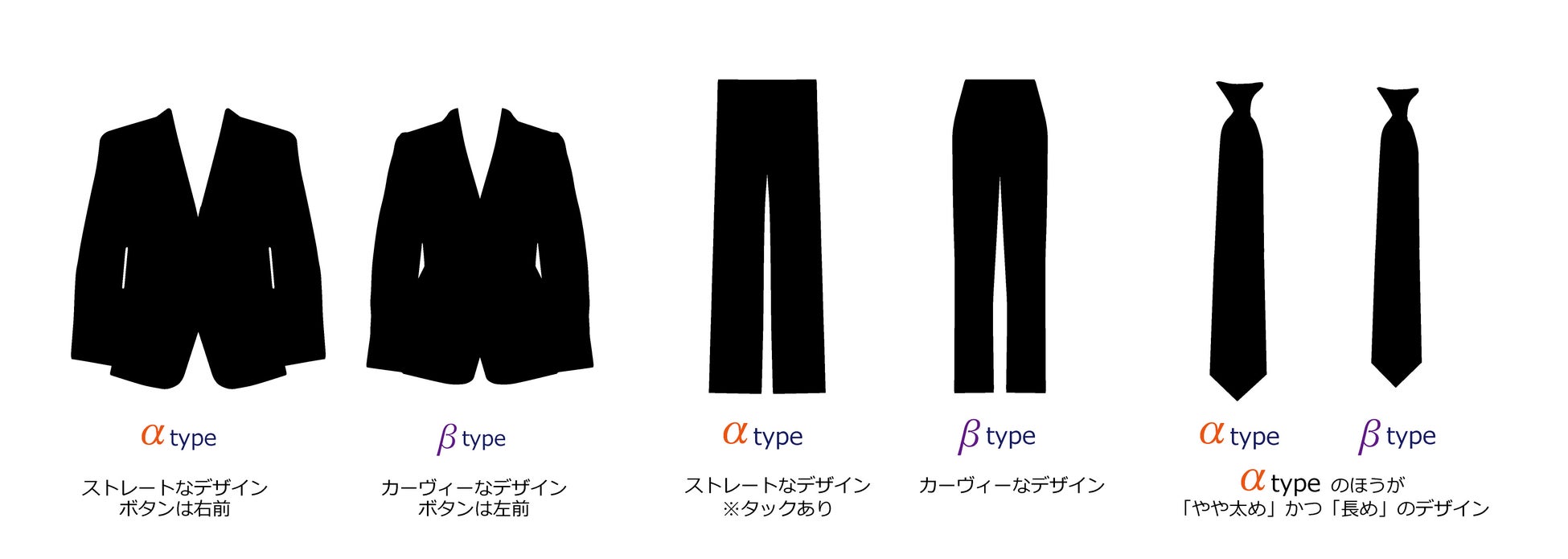 ジャケットとスラックスはストレートなシルエット「α type」とカーヴィーなシルエット「β type」の2つのデザインを展開。シャツやブラウス、ネクタイやリボンなどのバリエーション豊かなアイテムで、自由なコーディネートが可能になります。
