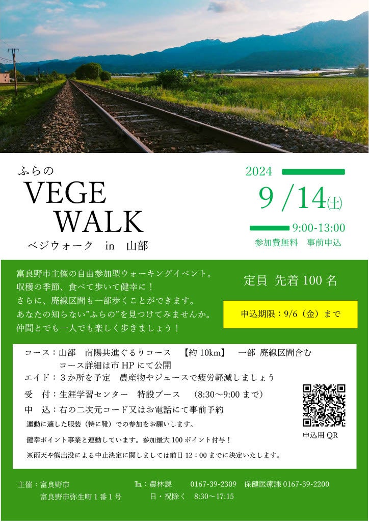 市内農村部を約10km歩きながら、地元の農産物をエイドステーションで味わいながら、健康への取り組みと地域の魅力を再発見してもらう機会を提供します。また、根室線の廃線となった一部区間も歩き、地域資源の活用について提示します。