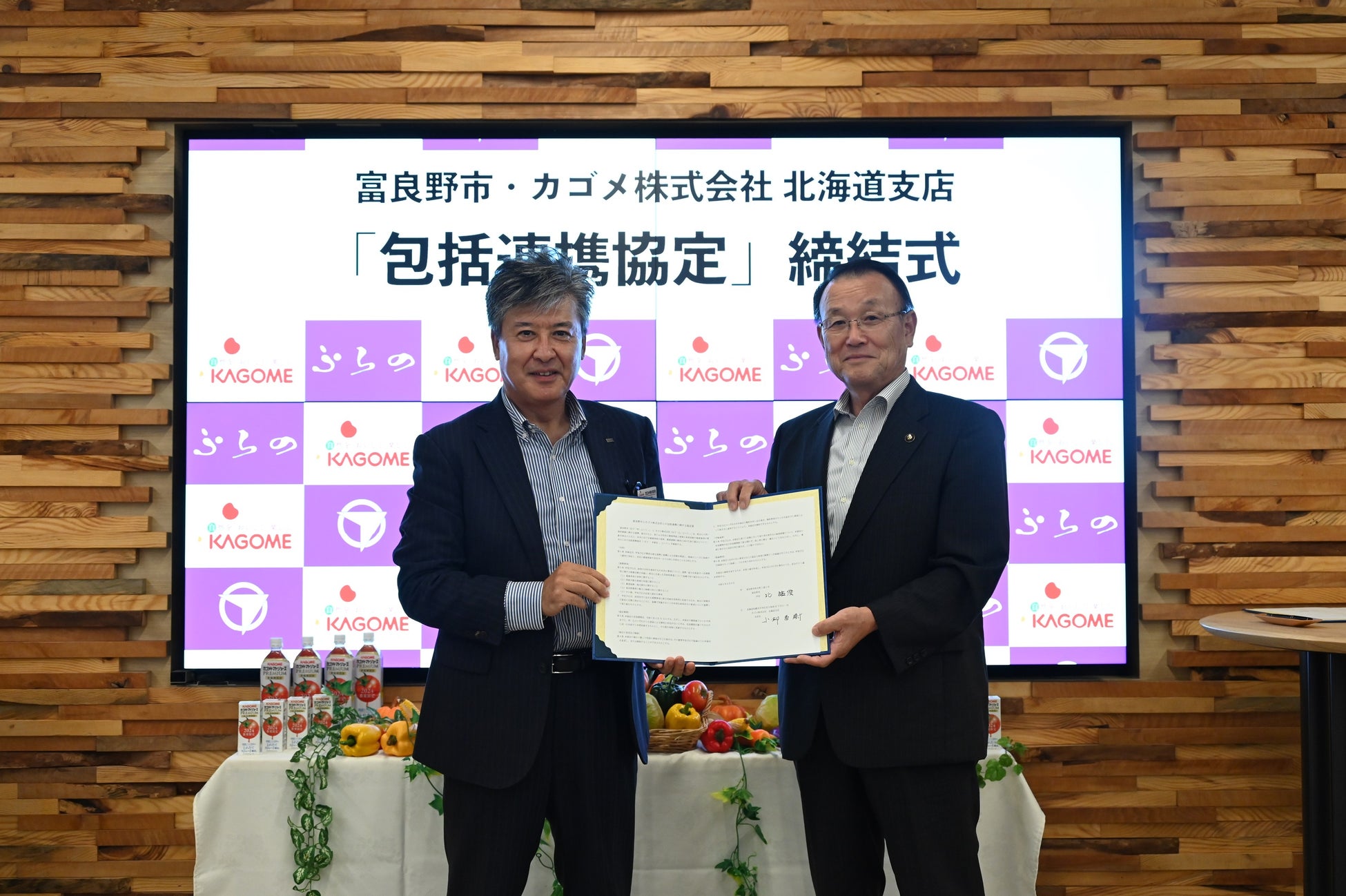 2024年8月8日、「健幸都市」を目指す北海道富良野市(市長 北 猛俊、以下「富良野市」)と「自然を、おいしく、楽しく。」を目指すカゴメ株式会社北海道支店(支店長 小柳秀樹、以下「カゴメ株式会社」)は、食による住民の健康増進と地域の食育活動や地産地消の推進を図り、健康寿命の延伸や健康課題の解決を目的に、野菜をきっかけとした『健幸都市』の推進に向け「富良野市とカゴメ株式会社との包括連携に関する協定」を締結しました。
