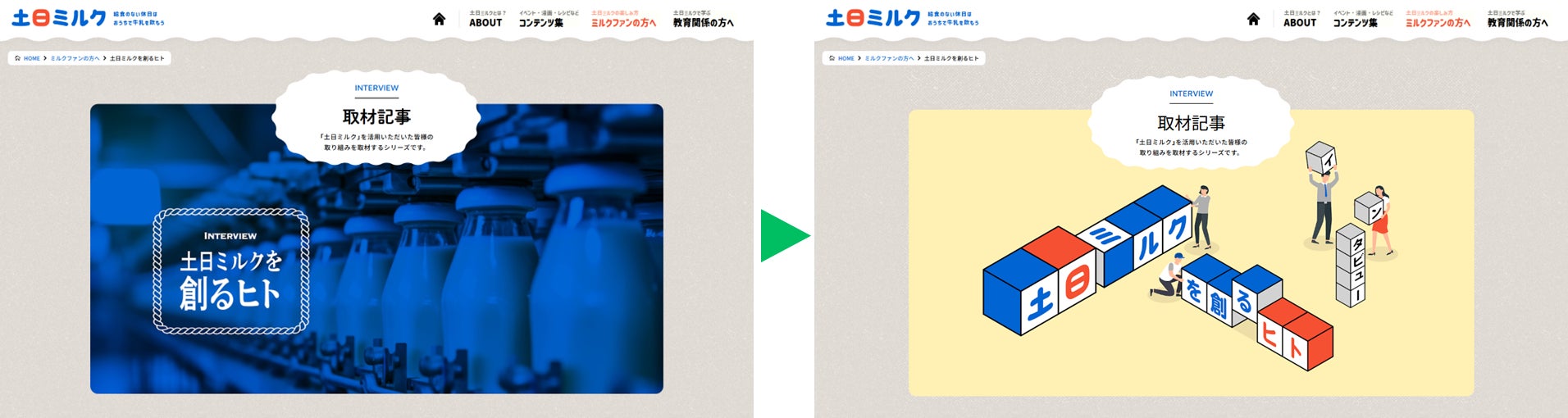 『土日ミルクを創るヒト』第2弾スタートにともない、ウェブサイトのイメージビジュアルを刷新。多くの人が協力し合いながら創り上げている様子を、ポップなイラストで表現したビジュアルを採用しています。