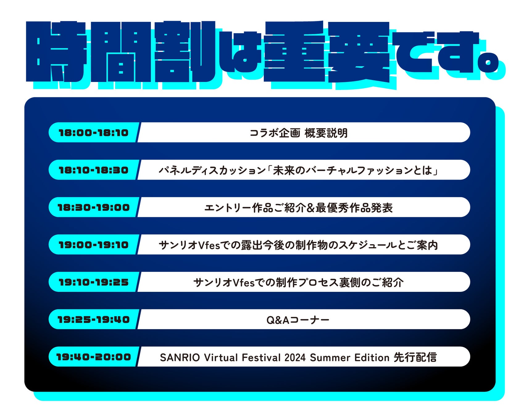 また、サンリオVfesに向けた今後の展開スケジュール、制作プロセス裏側の紹介、「未来のバーチャルファッション」を考えるパネルディスカッション。さらに、「SANRIO Virtual Festival 2024 Summer Edition」の先行配信など盛りだくさんの内容でお届けします。