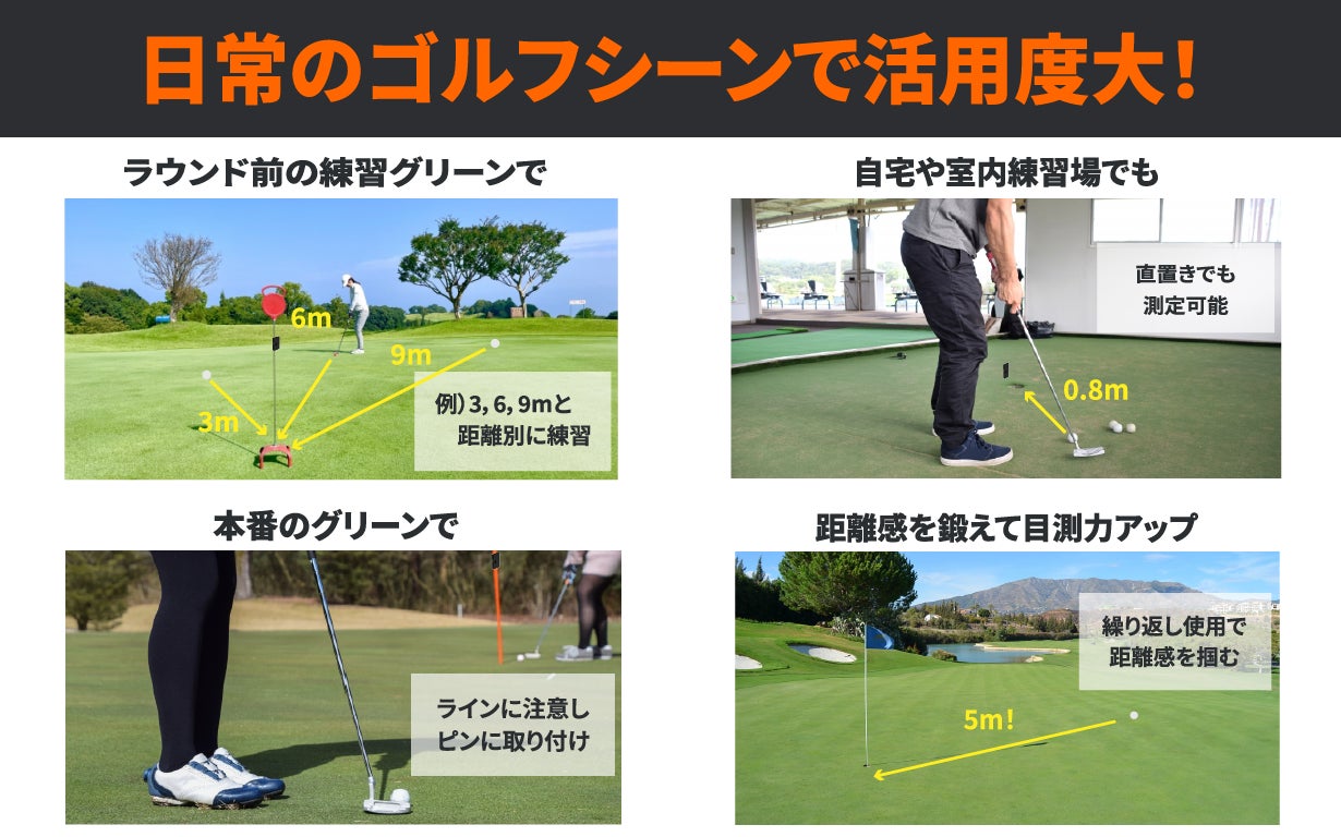 ラウンド前の練習グリーンで距離を計って練習。距離に合わせたパットの感覚が残っているので本番でも成功しやすくなります。直置きでも測定可能で室内練習でも使えます。本番のグリーンでは同伴者のラインを踏まないように外回りでサッとピンに装着すればマナー違反にはなりません。更には繰り返し距離測定を行うことで目測での距離感が身に付いていきます。また、公式競技以外でのローカルルールではピンに装着することは違反ではありません。