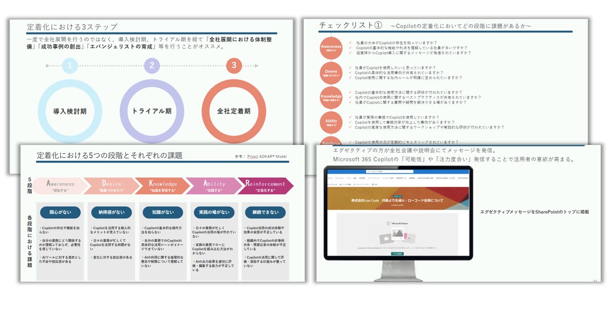 株式会社Low Code(本社:東京都品川区東五反田2丁目9-5、代表取締役社長:文山 泰汎 / 以下Low Code)は、大手企業のMicrosoft 365 Copilot(以下Copilot)の定着化支援を多数実施しております。そのナレッジを元に、Copilot利用者向けに「Copilot for Microsoft 365徹底活用ガイドブック」、Copilotの推進担当者向けに「Microsoft 365 Copilot活用率向上ガイドブック」を無料公開しております。以下URLよりダウンロードいただけます。