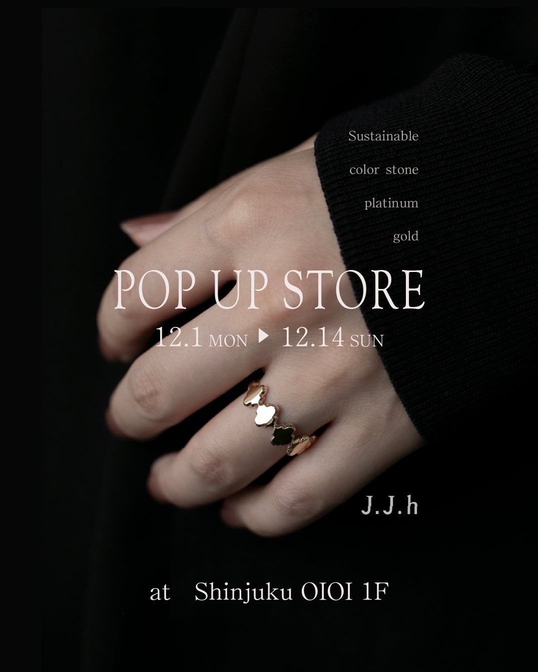 ジュエリーのリフォーム・修理、販売を行う、株式会社宝貴工芸(東京都台東区上野5-24-16 KDX御徒町ビル9階、代表取締役:小松 昌弘)は、サステナブルジュエリーブランド「J.J.h(ジェイ・ジェイ・アッシュ)」のPOPUPイベントを12月1日(月)~12月14日(日)、新宿マルイ本館1Fイベントスペースにて開催します。