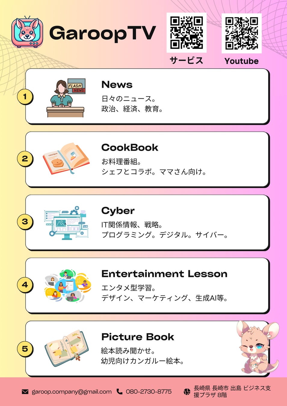 GaroopTVは、最新のテクノロジーとクリエイティブな発想を融合し、日々のニュースやIT情報、エンタメ学習、さらには絵本の読み聞かせまで、幅広いジャンルで視聴者に新しい発見を提供します。どの世代も楽しめるコンテンツラインアップで、家庭にワクワクをお届けします!