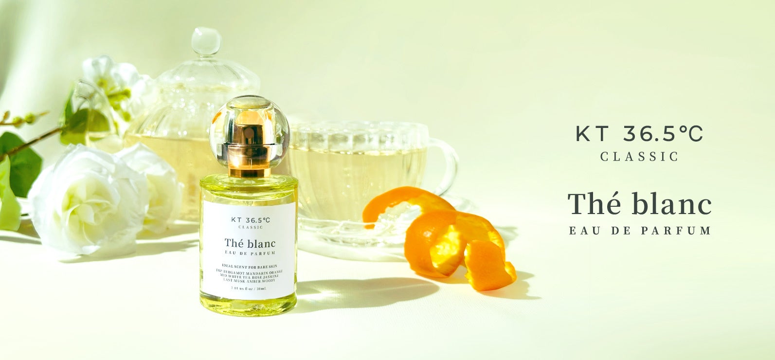 フレグランスブランド【KT36.5℃】は、ブランド7作目となる「CLASSIC」シリーズ第2弾として、ホワイトティーの透明感を纏う新作フレグランス『Thé blanc(テ・ブラン)』を発売いたします。