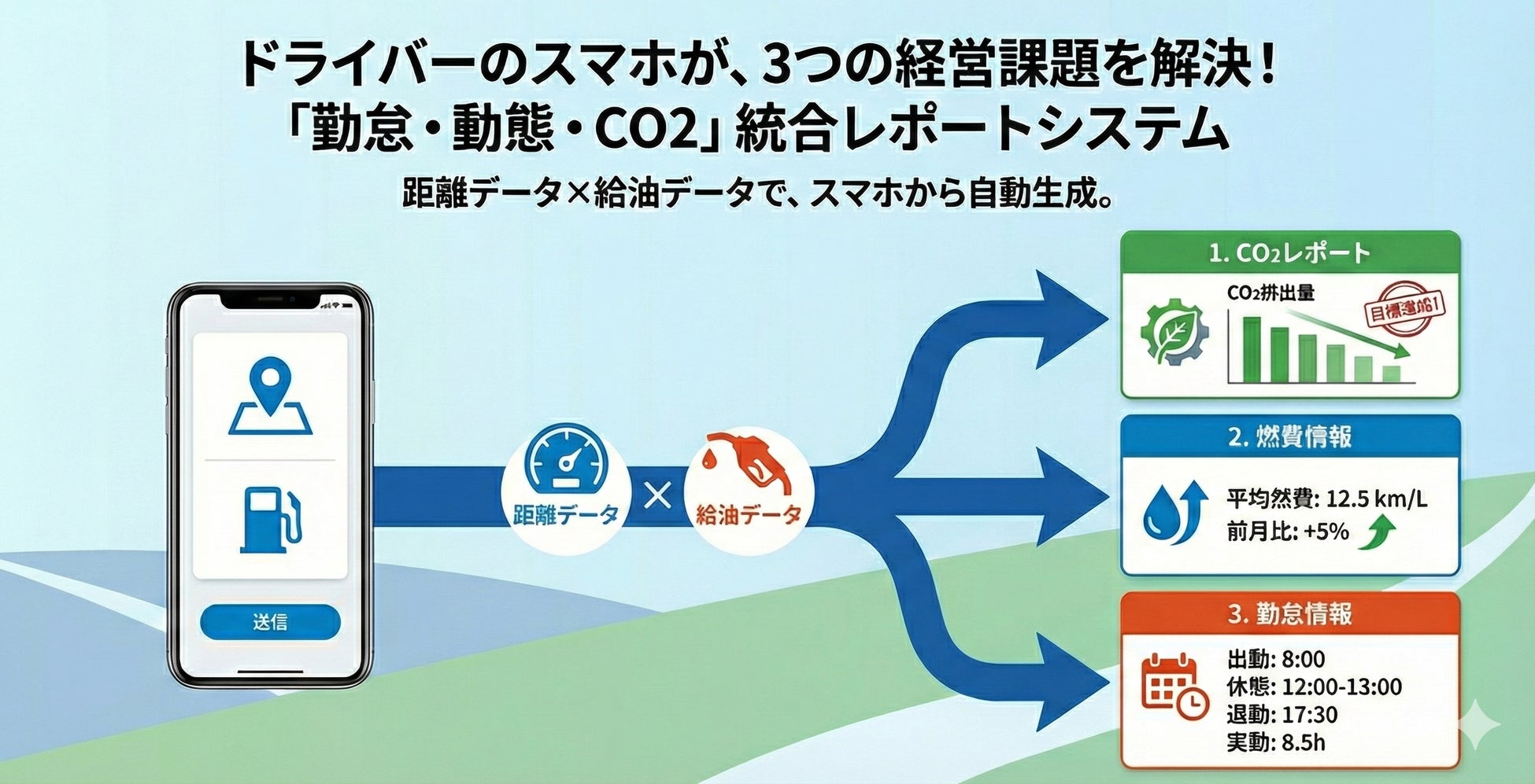 中小規模の運送会社様からは、「デジタコ、勤怠システム、さらに環境対応…とシステムばかり増えて『導入コスト』と『ドライバーの入力負担』が現場を圧迫している。」という悲鳴にも似た声を多くいただきます。 そこで当社は、「スマホのGPS位置情報」という一つのデータソースから、「CO2排出量」「燃費」「労働時間」のすべてを算出・管理する仕組みを開発しました。