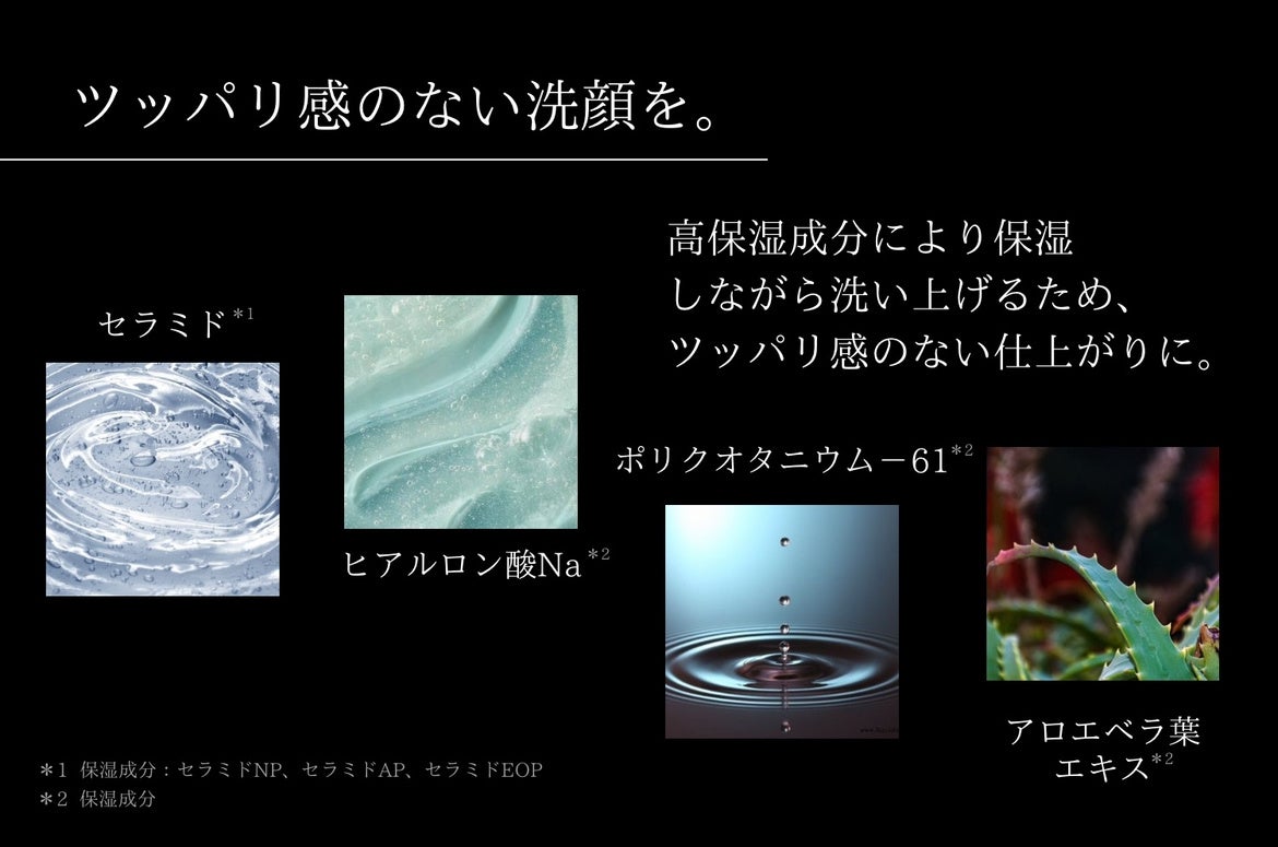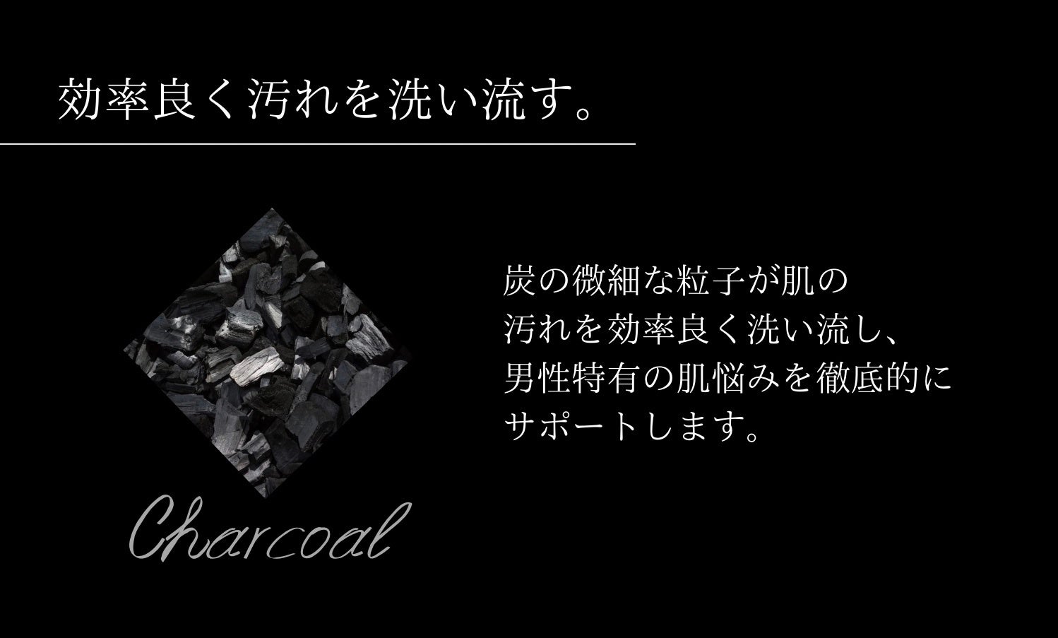 炭の吸着効果によりしっかりと汚れを洗い流し、男性特有の肌悩みを徹底的にサポートします。ヒアルロン酸*¹やセラミド*²などの保湿成分が肌に潤いを与え、自信溢れる弾力肌を作り上げます。