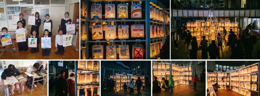 日本古来のあかり「行燈」にヒントを得た、西梅田発祥のペーパーバック型の手作りオリジナル行燈を展示。能登半島地震で被災された皆さんが作成した行燈も展示してチャリティー活動も実施。