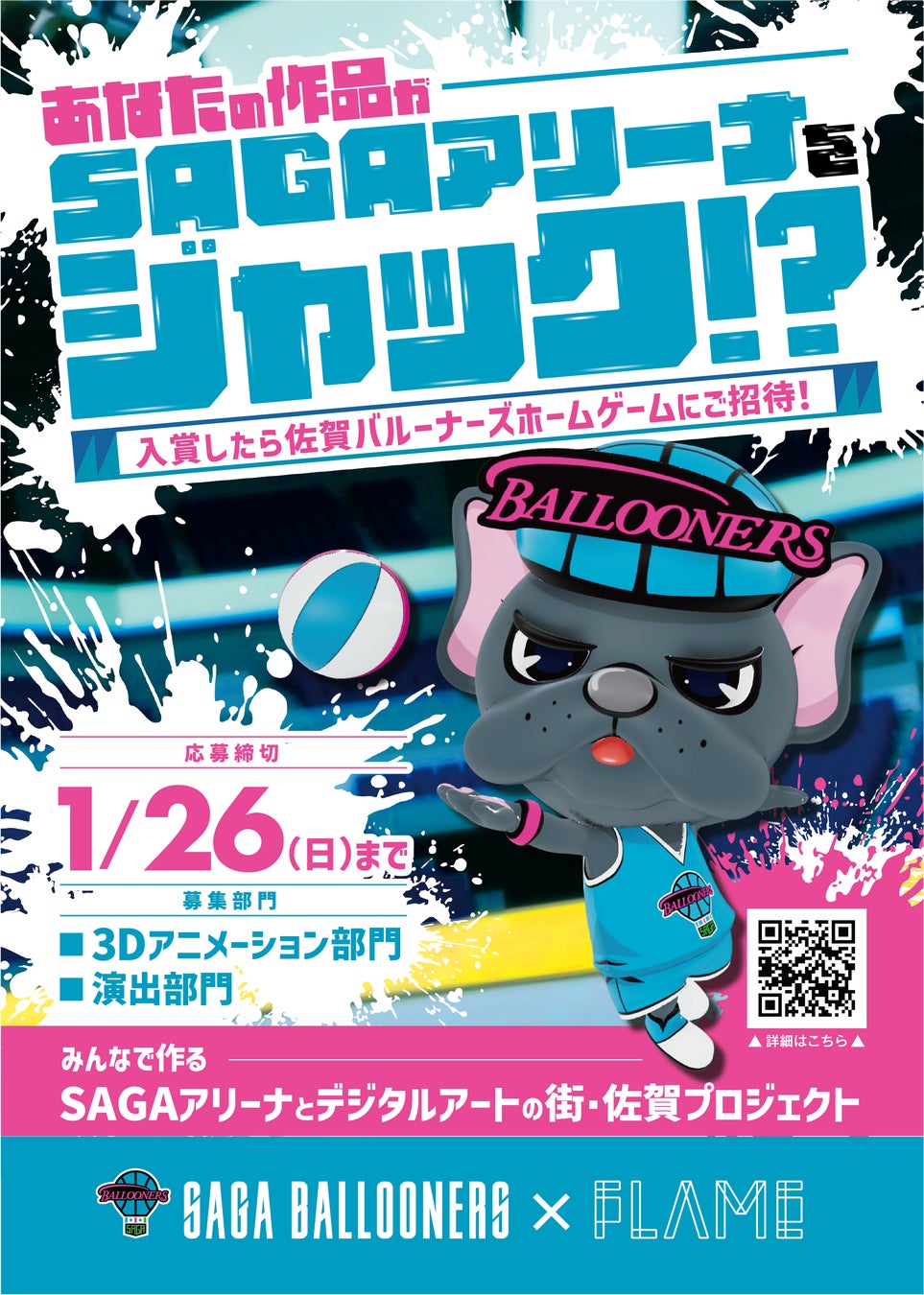 株式会社佐賀バルーナーズ(https://ballooners.jp/)と株式会社フレイム(https://flame.design/)の二社で、『みんなでつくるSAGAアリーナとデジタルアートの街・佐賀プロジェクト』としてデジタルアートコンテストを共催することとなりました。