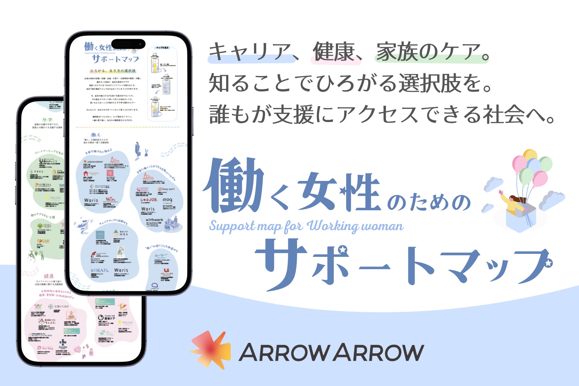 「ライフイベント」と「働く」が二者択一にならない社会の実現目指す特定非営利活動法人ArrowArrow(代表理事:海野千尋)は、女性が働き続ける中で抱える悩みや困りごとに合わせて、支援団体・企業を探せる「働く女性のためのサポートマップ」の無料公開を2025年6月30日(月)から開始しました。