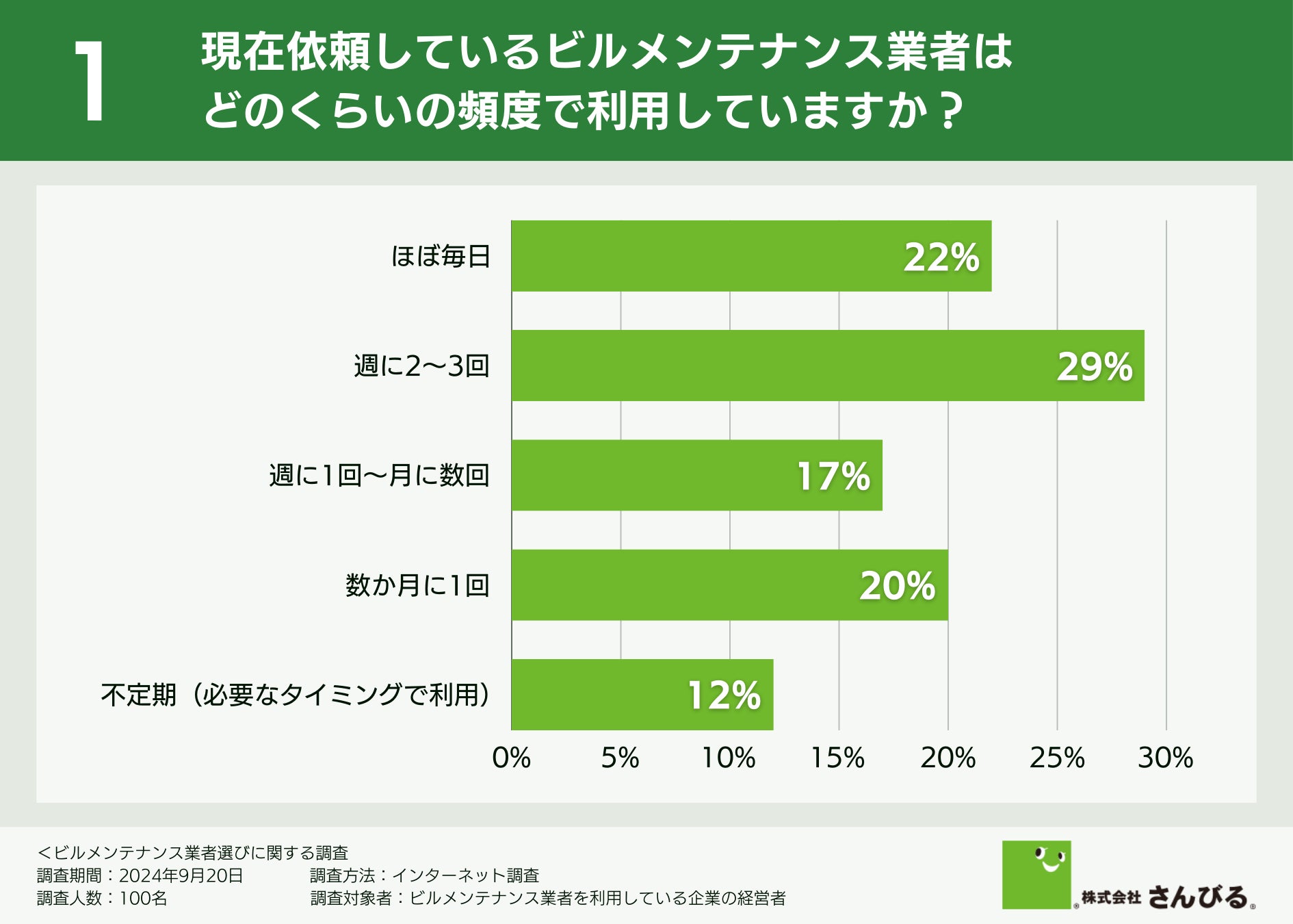 はじめに、現在依頼しているビルメンテナンス業者の利用頻度について伺ったところ、「週に2〜3回(29.0%)」「ほぼ毎日(22.0%)」という回答が多く集まりました。