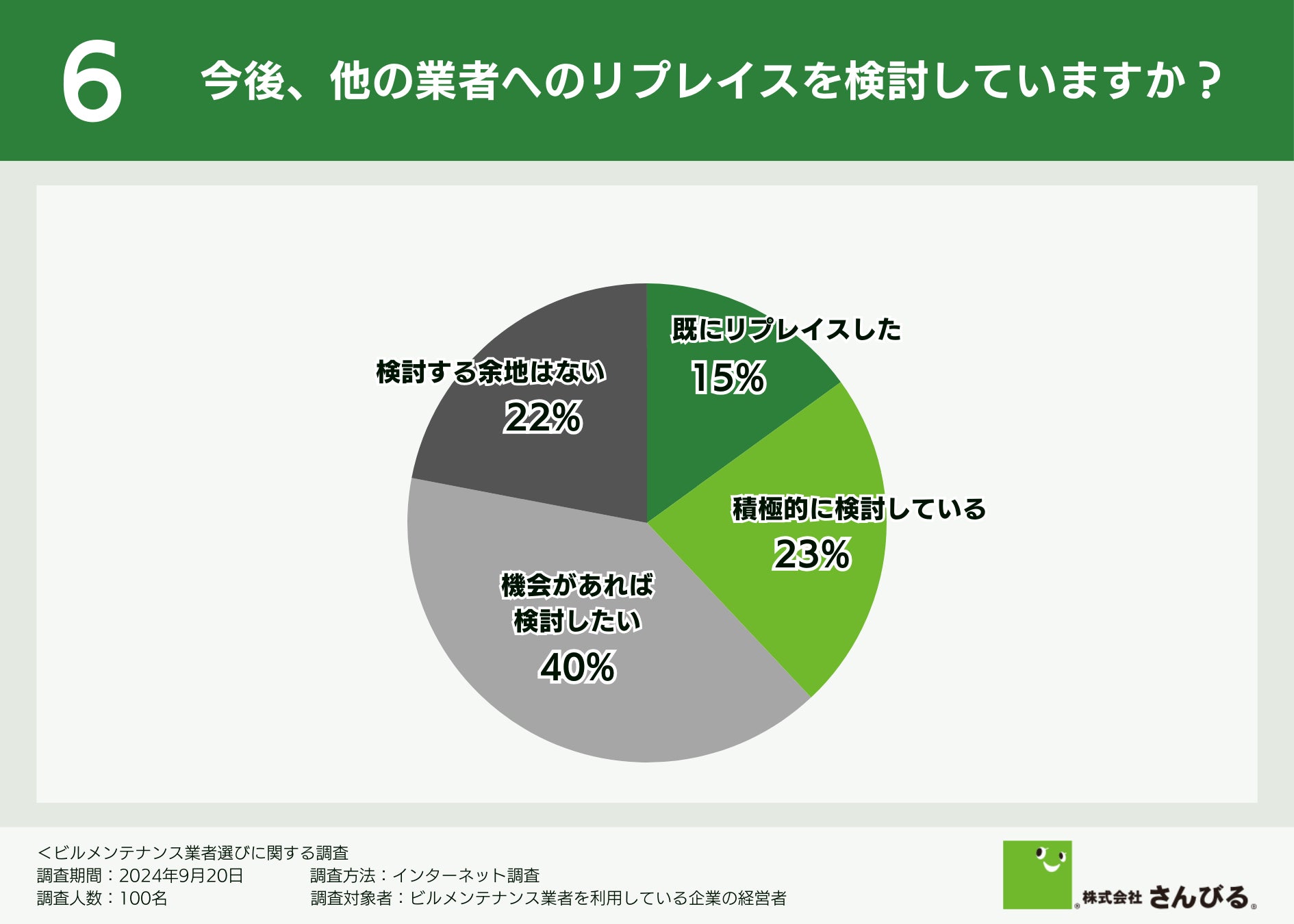 そこで、今後、他の業者へのリプレイスを検討しているか伺ったところ、「機会があれば検討したい(40.0%)」という回答が最も多いことがわかりました。