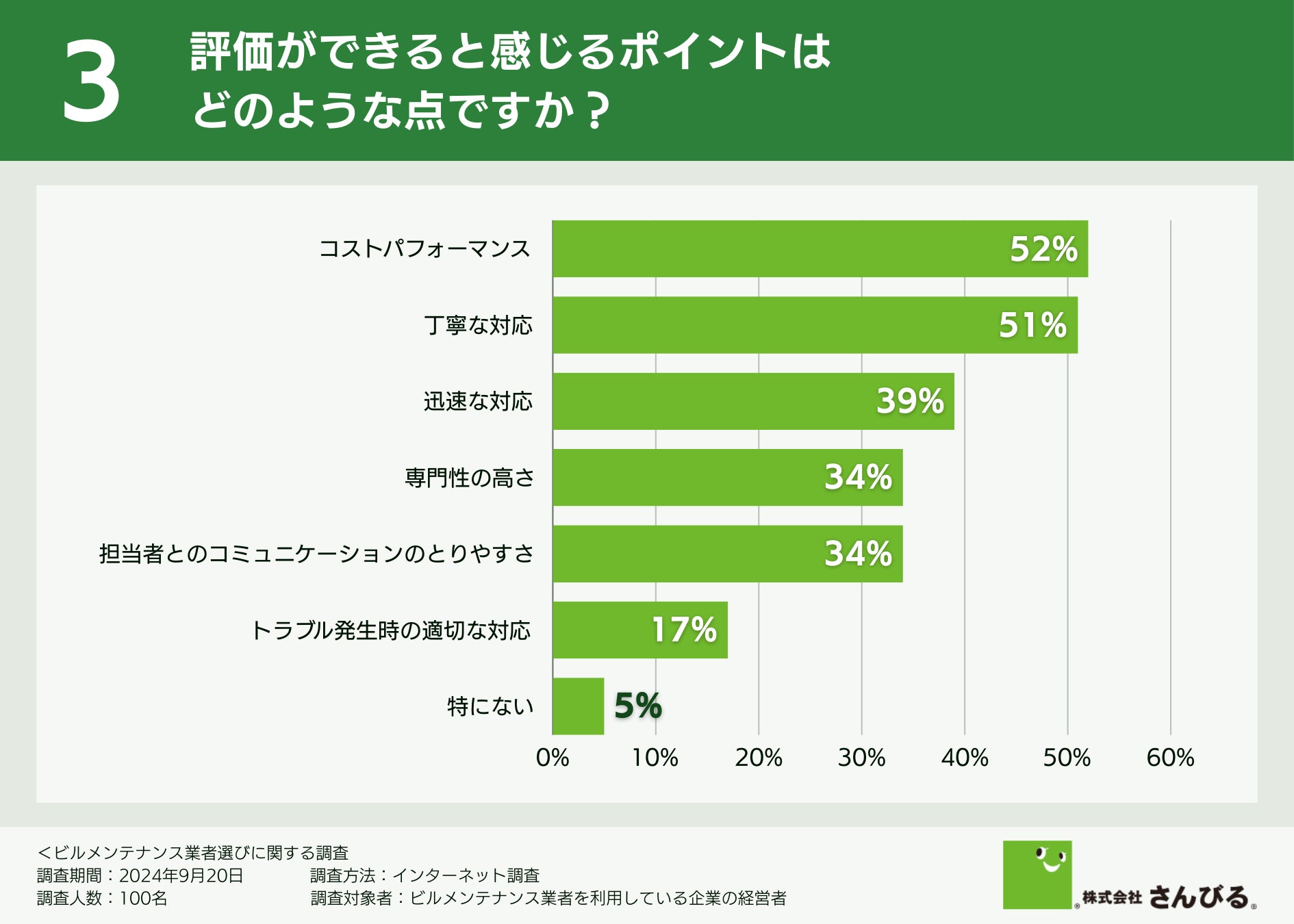 評価ができると感じるポイントについて伺ったところ、「コストパフォーマンス(52.0%)」「丁寧な対応(51.0%)」「迅速な対応(39.0%)」という回答が集まりました。