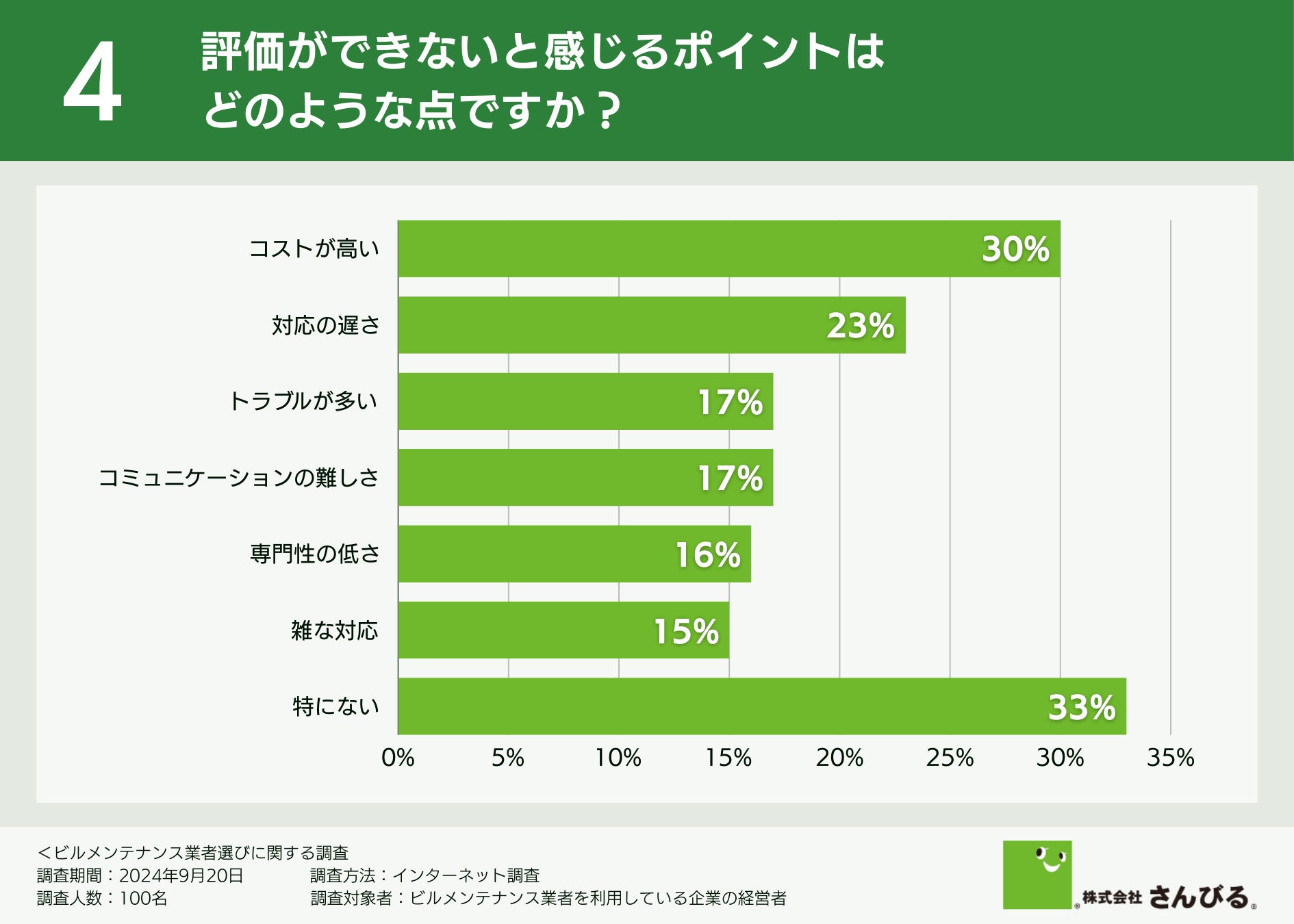 一方で評価できない点について伺ったところ、「コストが高い(30.0%)」「対応の遅さ(23.0%)」という回答が多く集まりました。