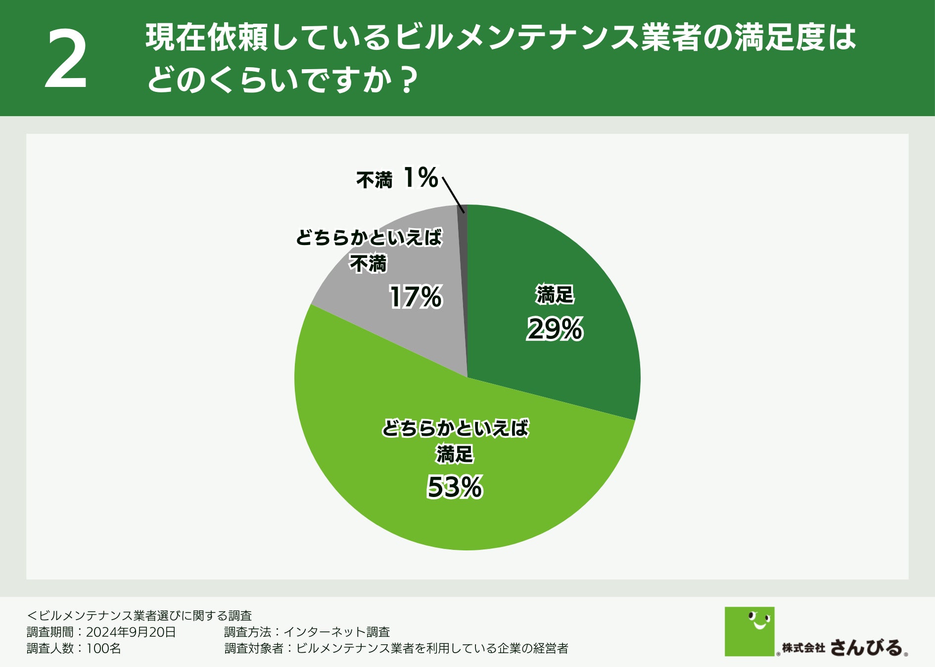 次に、現在依頼しているビルメンテナンス業者の満足度について伺ったところ、「どちらかといえば満足(53.0%)」「満足(29.0%)」という回答が集まり、全体の82.0%が業者に満足している結果となりました。