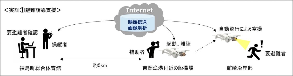 ・実証① LTE通信によりドローンを遠隔制御するとともに、空撮映像のリアルタイムな「映像伝送×AI画像解析」を活用した避難誘導支援