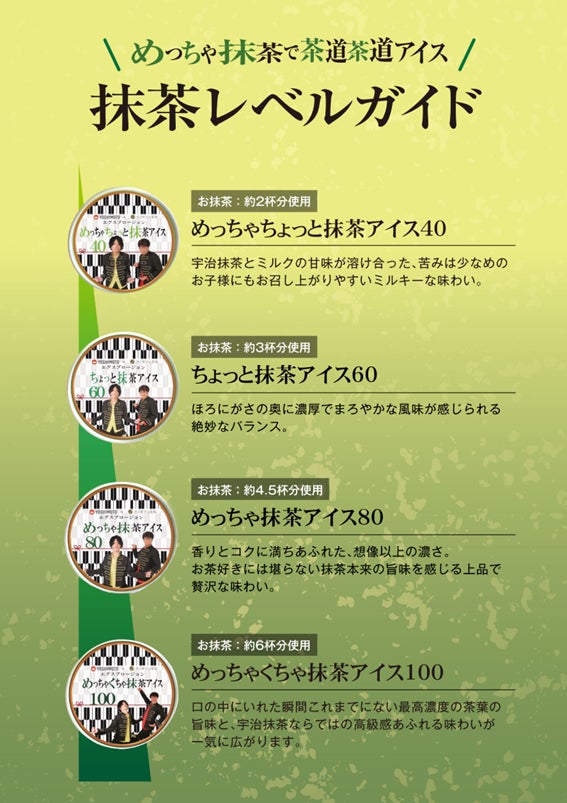 「めっちゃ抹茶で茶道茶道アイス」は、4種類の抹茶の濃さの食べ比べができる商品です。