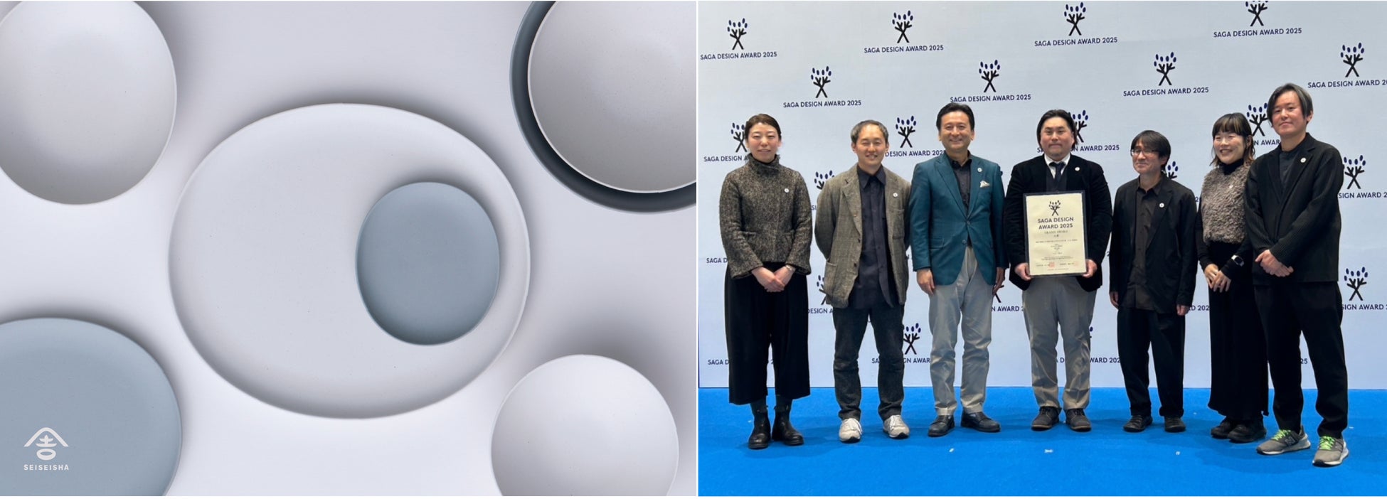 肥前吉田焼では、次世代につなげるため、脱炭素や不良品率の低下を目指す陶土「晟土(せいど)」の開発を行ってきました。この土で製造すれば、焼成時の二酸化炭素排出量が通常の磁器製造より40%削減、かつ1.5倍の強度を持ちます。この取り組みが、佐賀県主催の第一回「SAGA DESIGN AWARD」で評価され、最初の製品「うづら」(精成舎)がグランプリを受賞しました。2025年2月8日授賞式が行われ、224porcelainの辻諭が佐賀県知事より認定証を受け取りました。