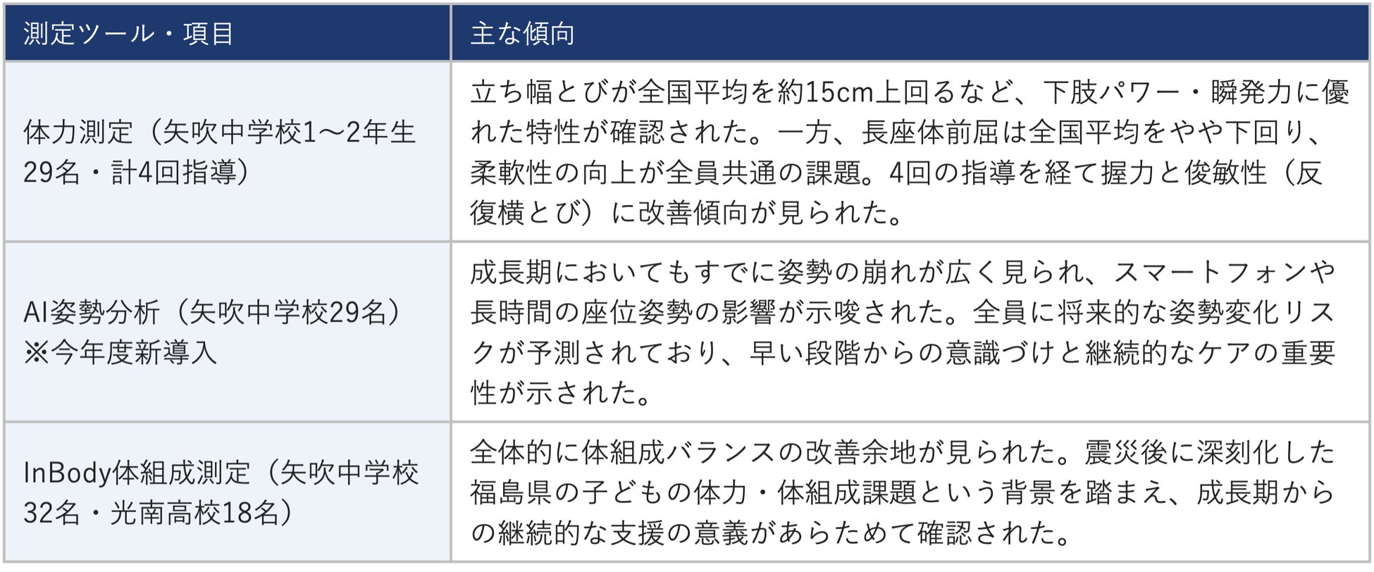 令和8年度も学校側と協議を行い、継続して実施する予定です。体力・体組成・姿勢の3軸データを年度をまたいで蓄積していくことで、生徒一人ひとりの成長の変化を長期的に把握し、競技力向上とスポーツ障害予防の両面に活用していくことを目指します。