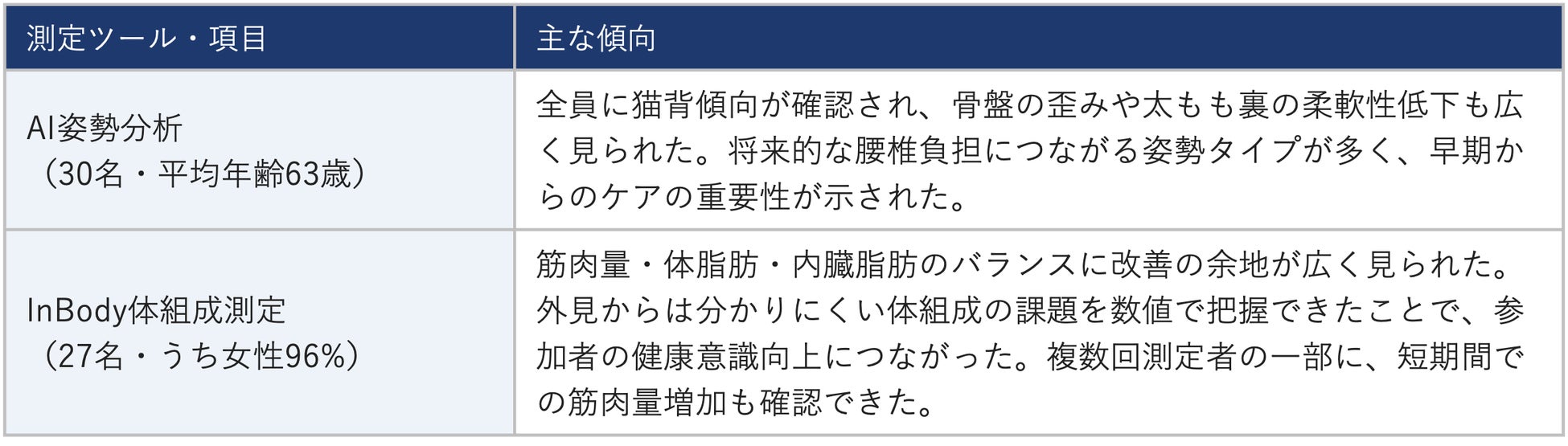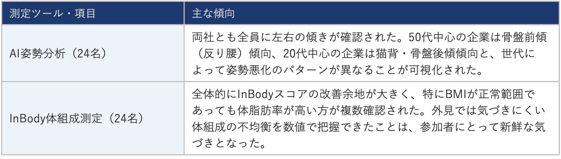 健康診断以外の機会に自分の身体の状態を詳しく把握することが難しい働き世代に対して、職場という身近な場所でアプローチする今回のモデルは、地方企業における健康経営支援の一つの形として機能することが確認できました。また、年齢層によって姿勢の崩れ方や体組成の課題が異なることも明らかになっており、世代に応じたプログラム設計の必要性が示されています。
