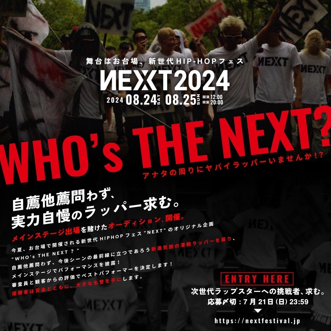 「NEXT」は、”次世代のシーンをMAKEする若い世代を応援する”をコンセプトに、このフェスを通じてラップスターを世間に輩出し、”ジャパニーズドリーム”の誕生地となることを目指しております。そこで、8月24日(土)から2日間開催するHIOHOPフェス「NEXT2024」のオープニングイベントにて、未来のラップスター応援企画「WHO's THE NEXT?」を実施します。年齢や経験は不問で、本当にイケてる奴がスポットライトを浴びれる、忖度なしのリアルドキュメンタリー企画です。自薦、他薦も大歓迎ですので、腕に自信のあるラッパーのチャレンジをお待ちしております!
