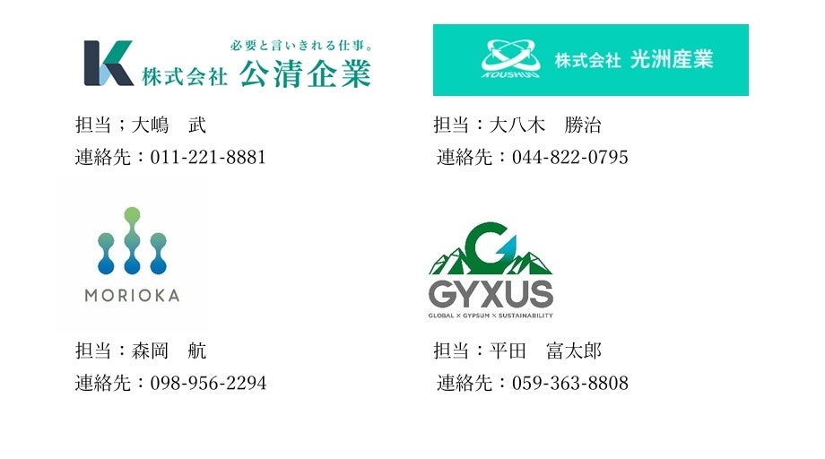 株式会社公清企業(本社:北海道札幌市)、株式会社光洲産業(本社:神奈川県川崎市)、株式会社森岡産業(本社:沖縄県読谷村)、株式会社GYXUS(本社:三重県四日市市)の4社(以下、本事業者)は、石膏ボード廃棄物(以下、廃石膏ボード)を100%主原料として石膏ボードを生産する水平リサイクル技術を用いて、石膏ボード資源循環事業の投資計画を推進することをお知らせいたします。