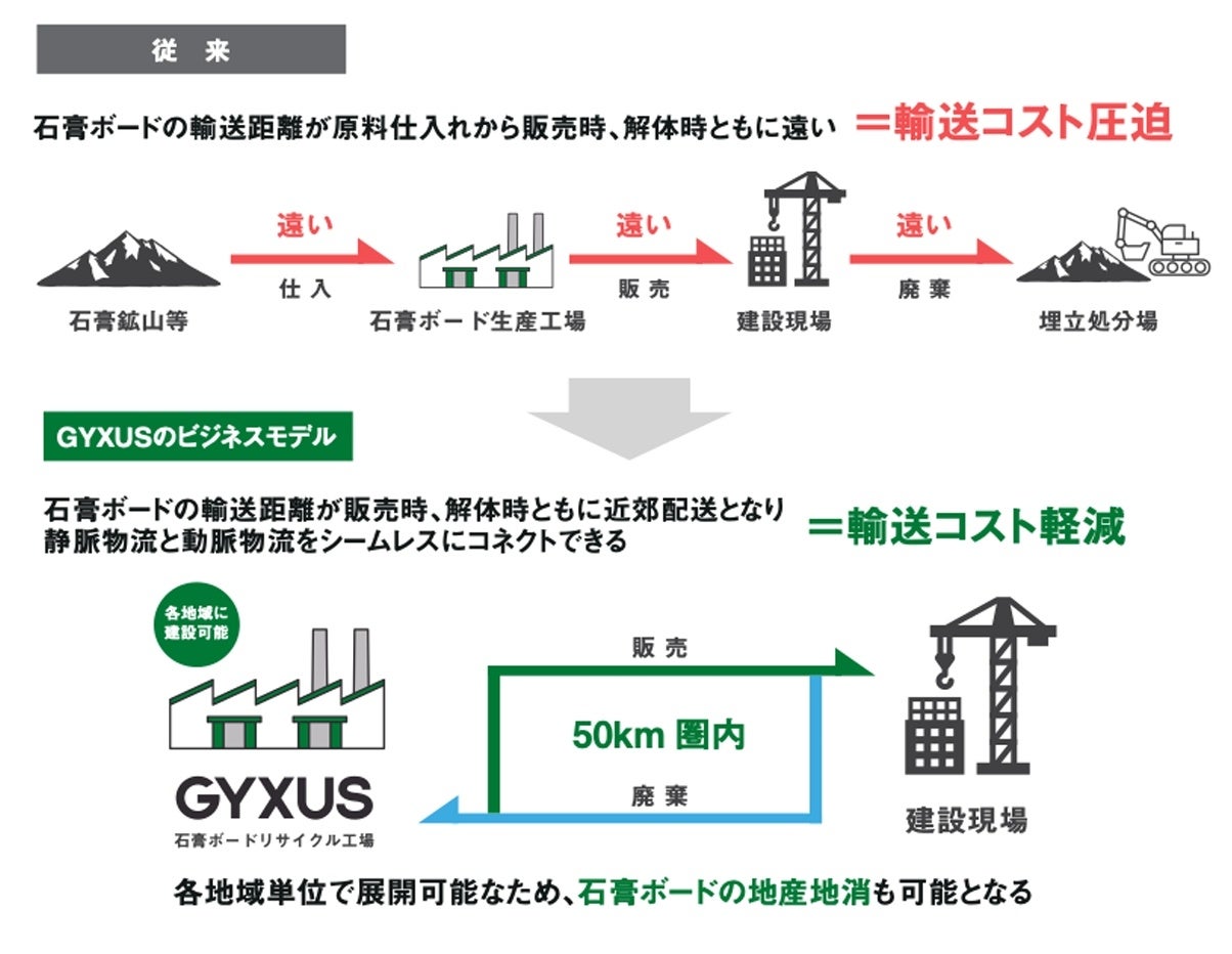 当社は石膏ボードリサイクル率の向上を通じて「地球に埋めない世界」を目指しています。今回当社が開発した独自技術「GYXUS CORETECH」の採用により、計画中も含めて複数の工場建設に目途がついた事は甚大の喜びです。今後も全国各地の事業者様と連携し水平リサイクルプラントを増設すると共に、世界の石膏ボードリサイクル率の向上に貢献できるように努めてまいります。