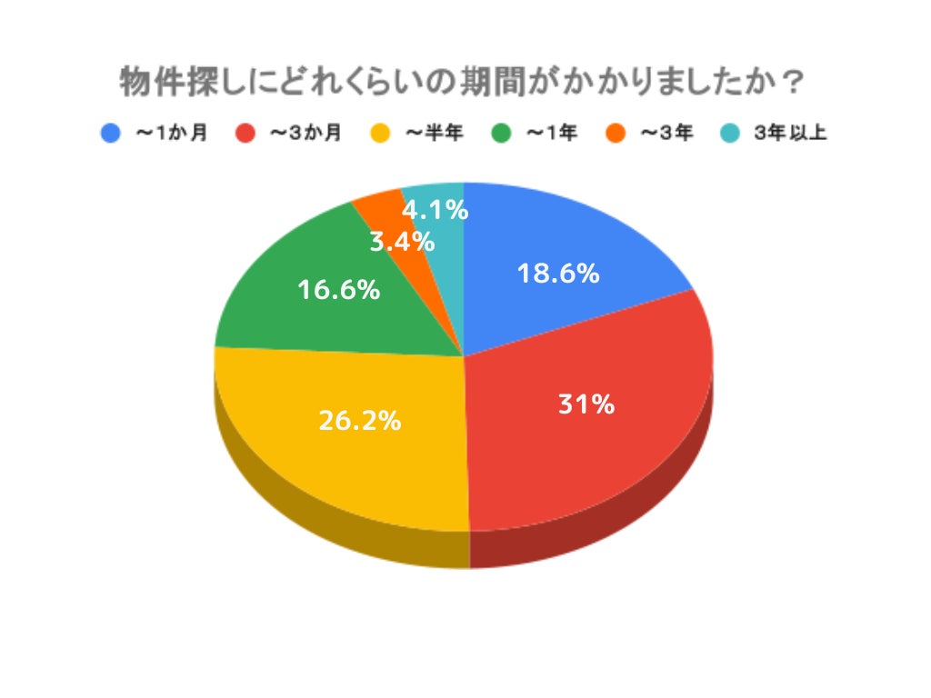 物件探しに1ヶ月〜3ヶ月かかると回答した人は約50%、半年〜3年以上かかると回答した人が約50%もいることがわかりました。