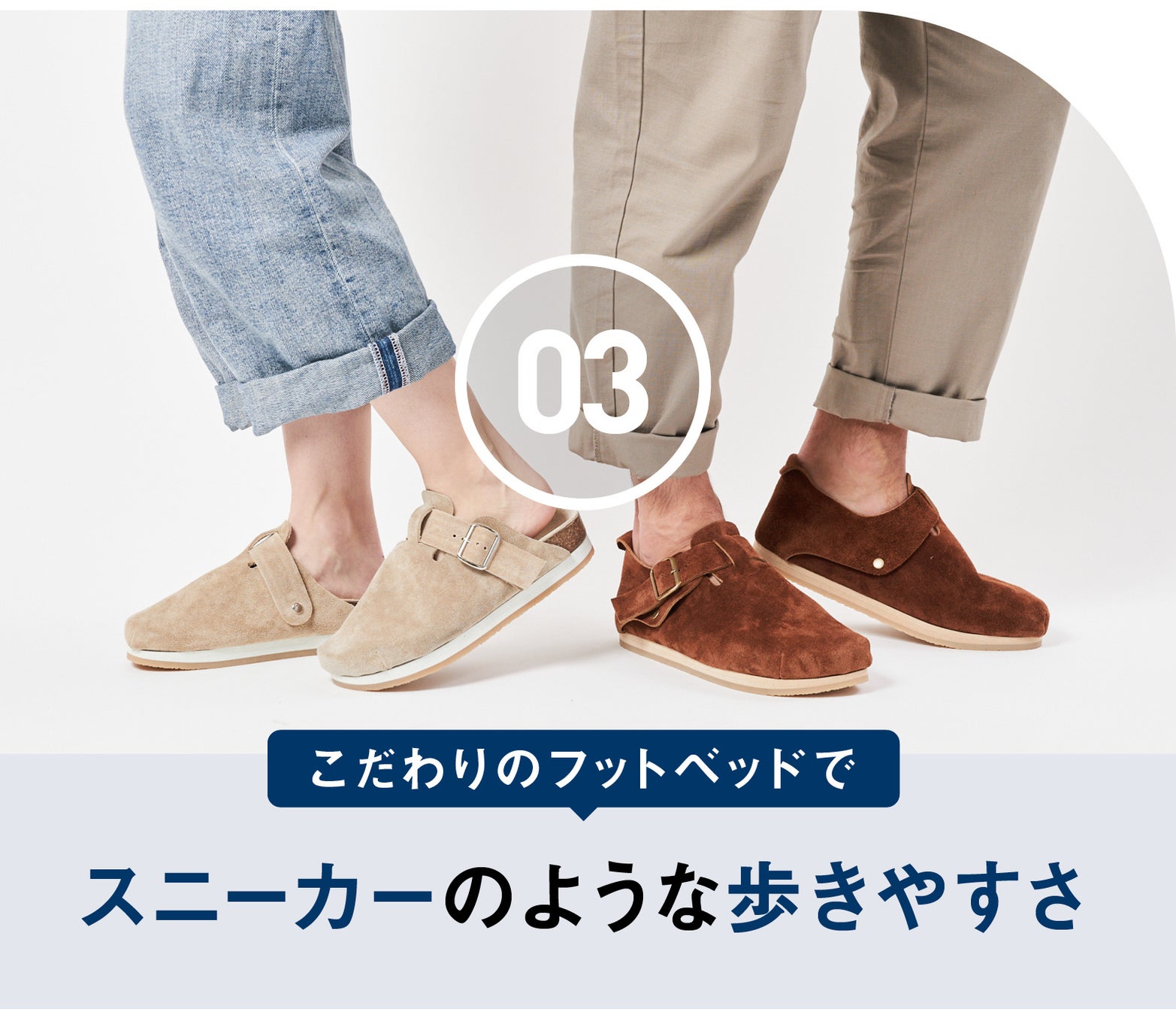 アッパーやフットベッドに使用しているのは日本製の『牛革』、高級感のある風合いはもちろん、合皮に比べ長持ちするのも特長です。