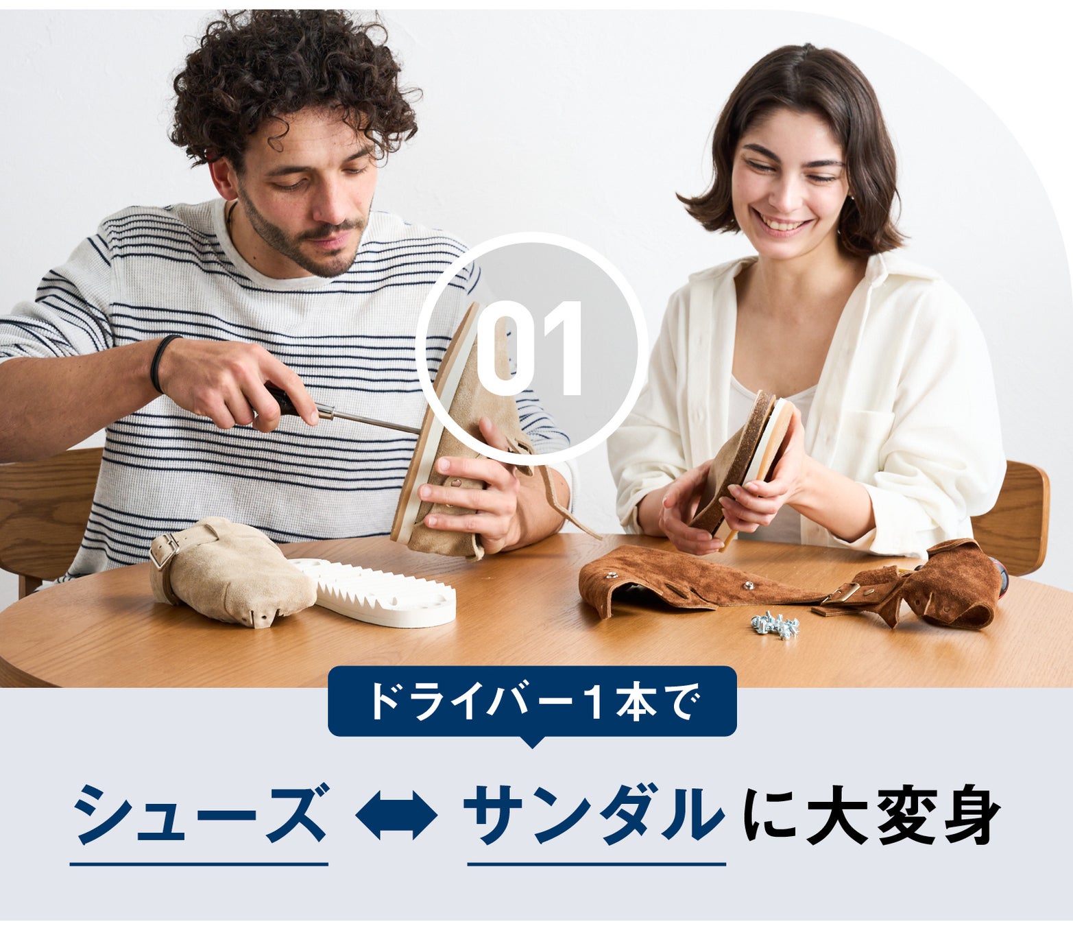 『Foot bed シリーズ』は、アッパー・フットベッド・ソールを19本のネジで固定しているので、ドライバー1本で誰でも簡単に分解・組み立てが可能。