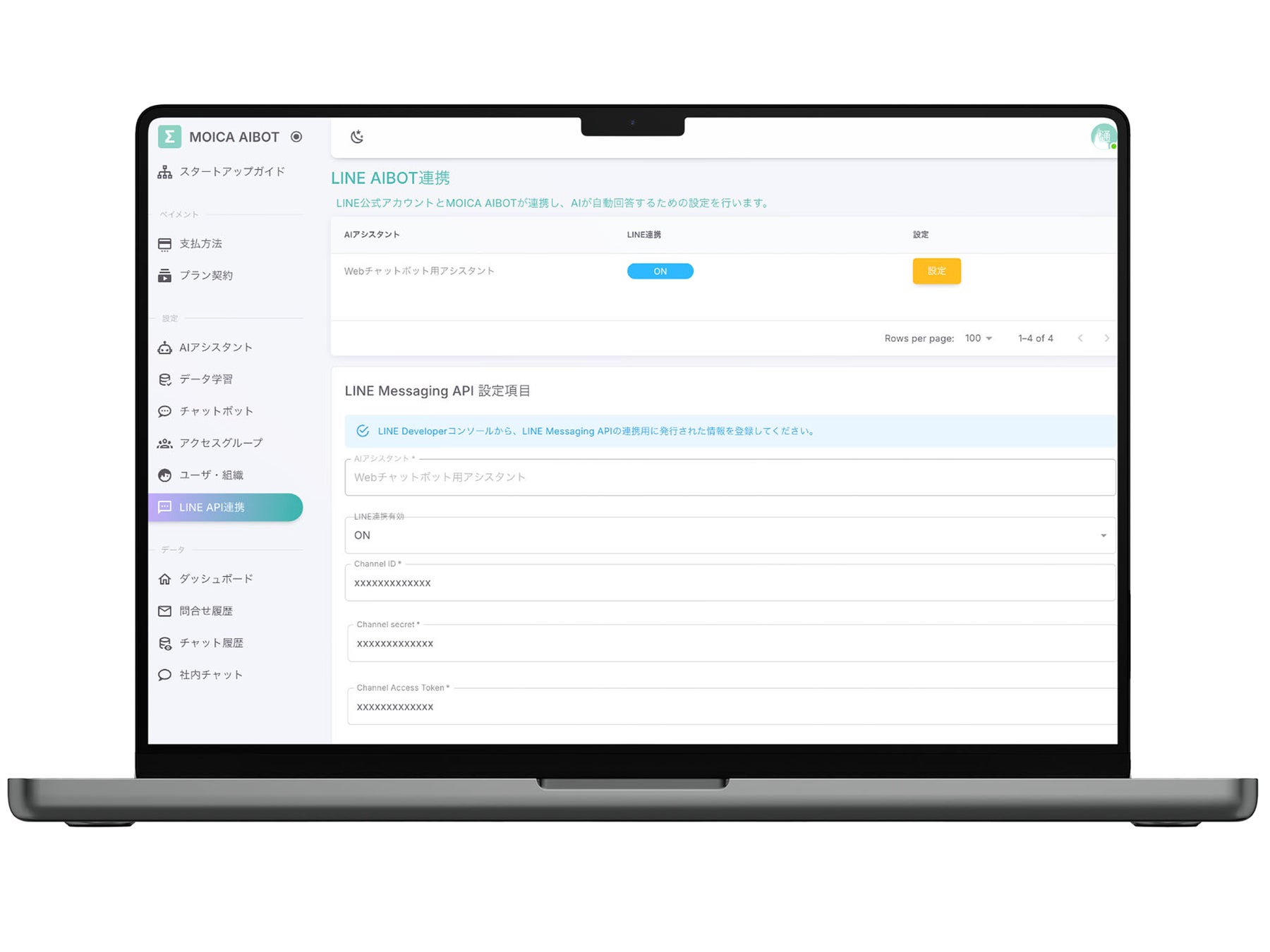 LINE公式アカウントの管理ツール上で取得した内容を、MOICA AIBOTの管理ツール上で設定し、