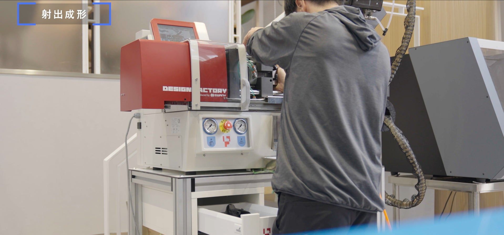 SWANYデザインファクトリー®…オフィス環境で小スペース、省電力で設備設置が可能。このスペースでは手のひらサイズの部品であればABS、PS、POM、エラストマー樹脂などのプラスチック部品の初期設計検討試作から3000個の小ロット生産まで製造することができる未来型の革新的コンパクトファクトリー。