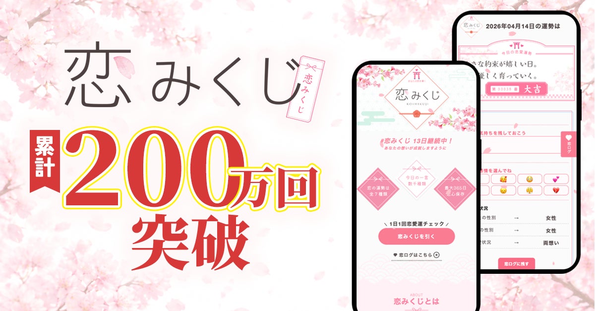株式会社ギミックプラス(本社:東京都中野区、代表取締役:岡本康志)は、診断コンテンツを気軽に楽しめるポータルサイト「Makko(マッコウ)診断ポータル」にて提供する、無料の恋愛占いコンテンツ「恋みくじ」が、2025年のサービス開始から1年を待たずして累計利用回数200万回を突破したことをお知らせします。