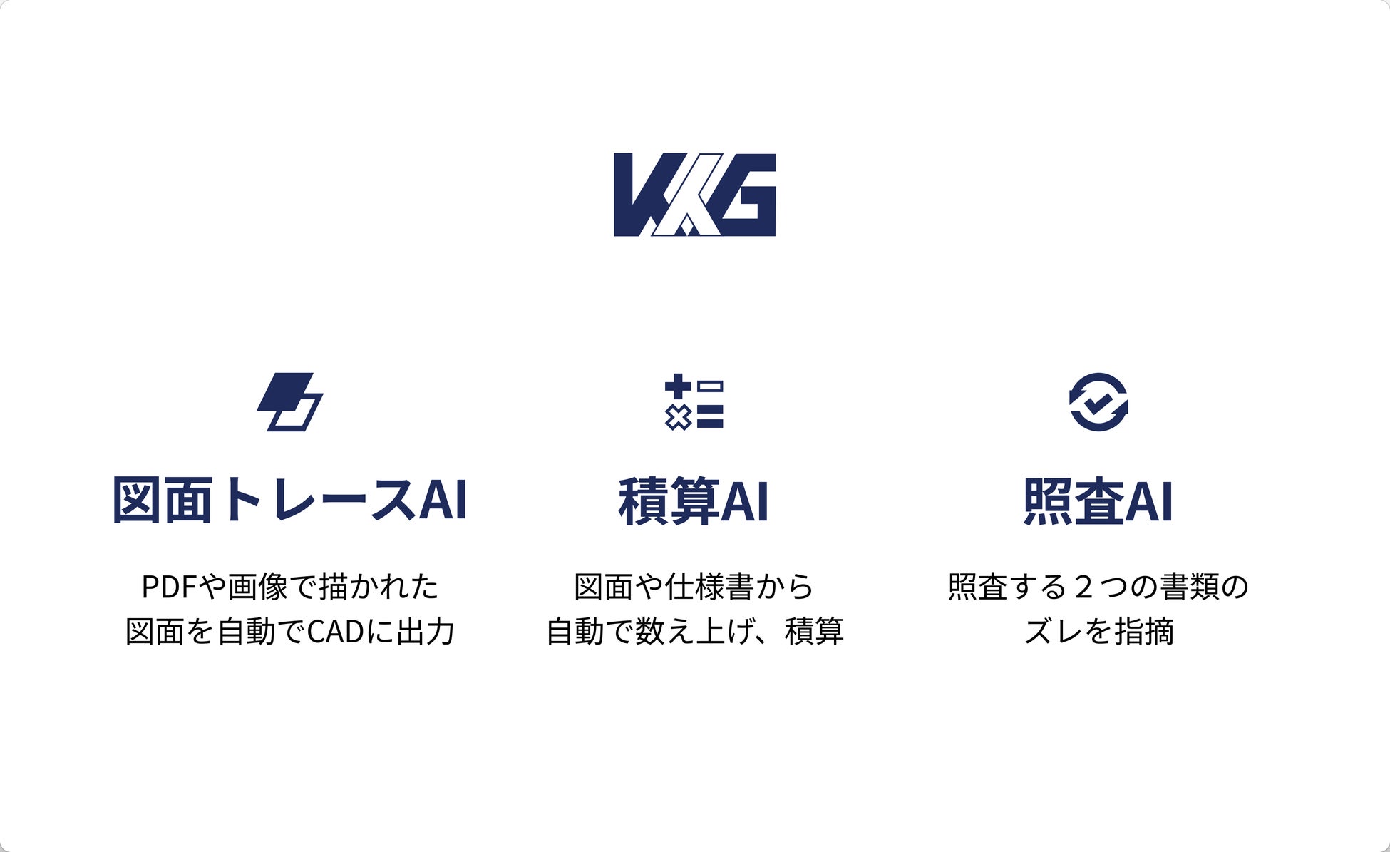 2024年11月、建設・製造業界の企業様向けに当社初となる3つの独自AIプロダクト「図面トレースAI/積算AI/照査AI」をリリースいたしました。(現在は図面トレースAIは積算AIの1機能としてご提供、照査AIは検図・照査AIに名称変更済)