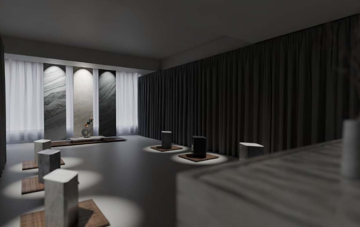 この繊細な水の動きは、SPLINE DESIGN HUB との協働により、独自設計の装置を用いて実現しました。水という自然物と最新技術が交わることで、静けさの中に生命感を感じさせる風景を再現して